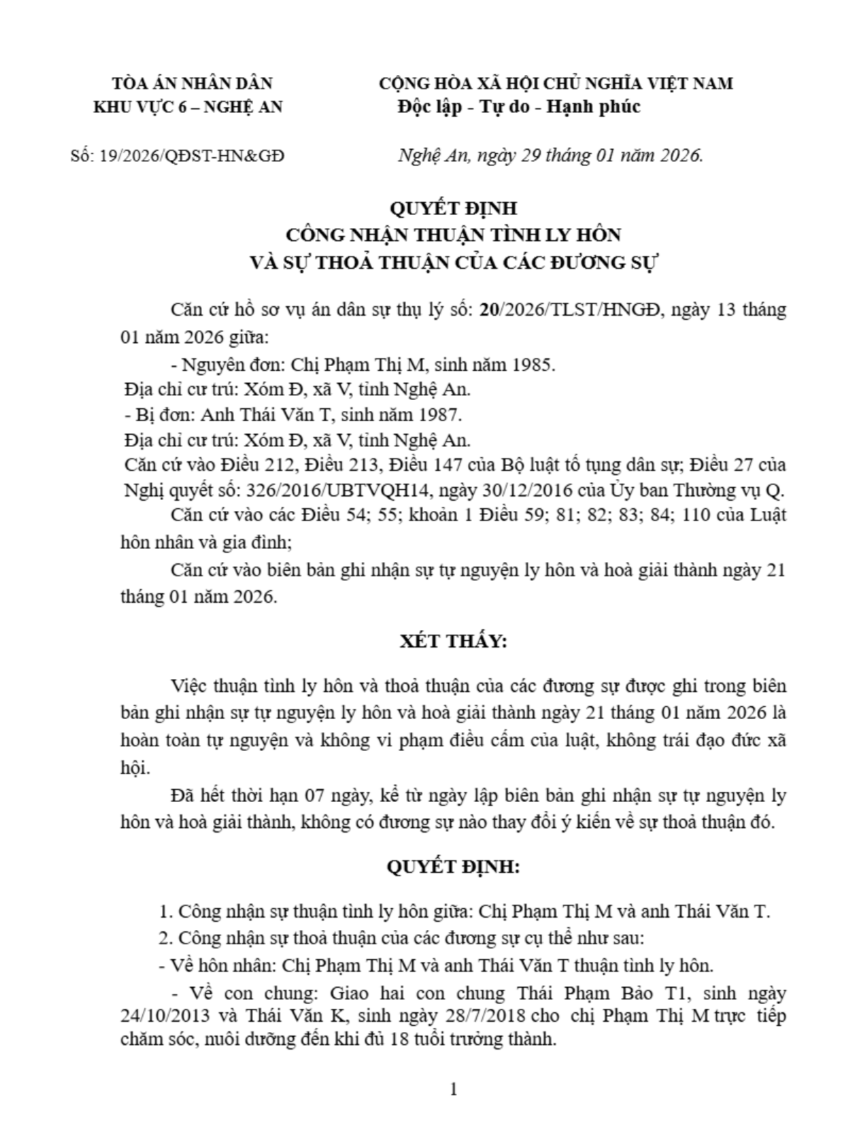 Quyết định số 19/2026/hngđ-st ngày 29/01/2026 của Tòa án nhân dân khu vực 6 - Nghệ An, tỉnh Nghệ An về vụ án ly hôn về mâu thuẫn gia đình