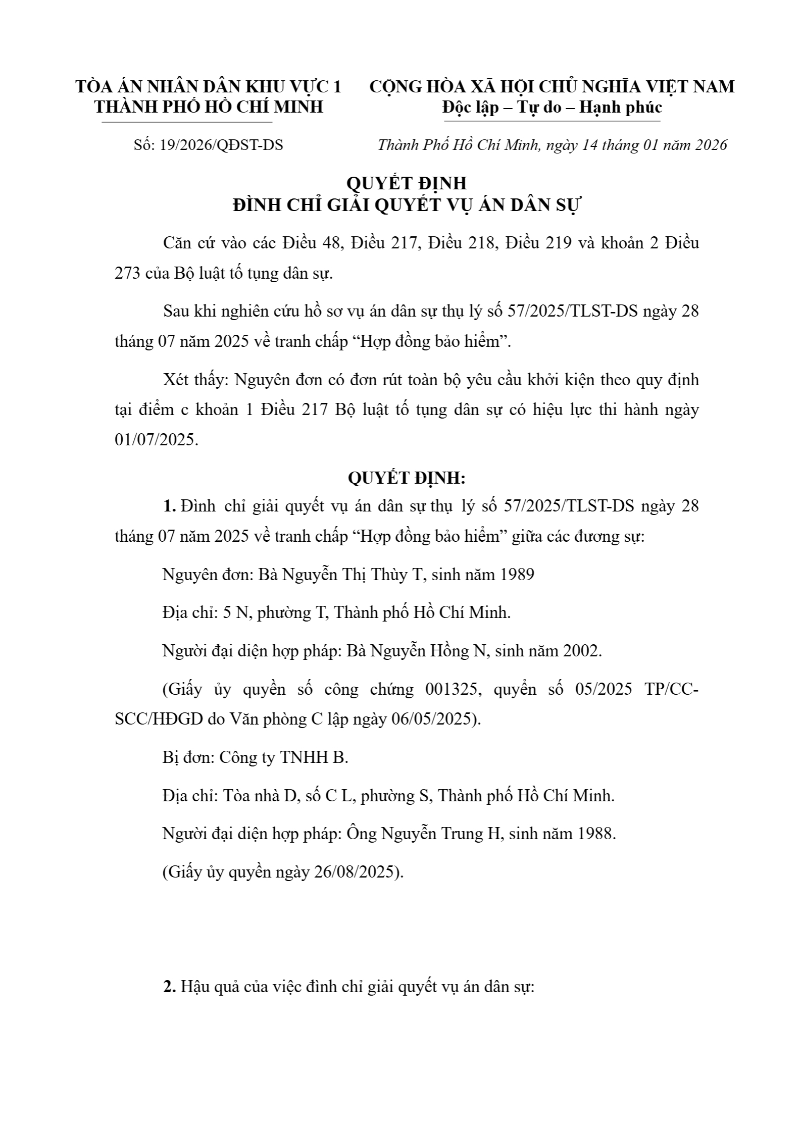 Quyết định số 19/2026/QĐST-DS ngày 04/01/2026 của Tòa án nhân dân khu vực 1 - Hồ Chí Minh, TP. Hồ Chí Minh về tranh chấp hợp đồng bảo hiểm