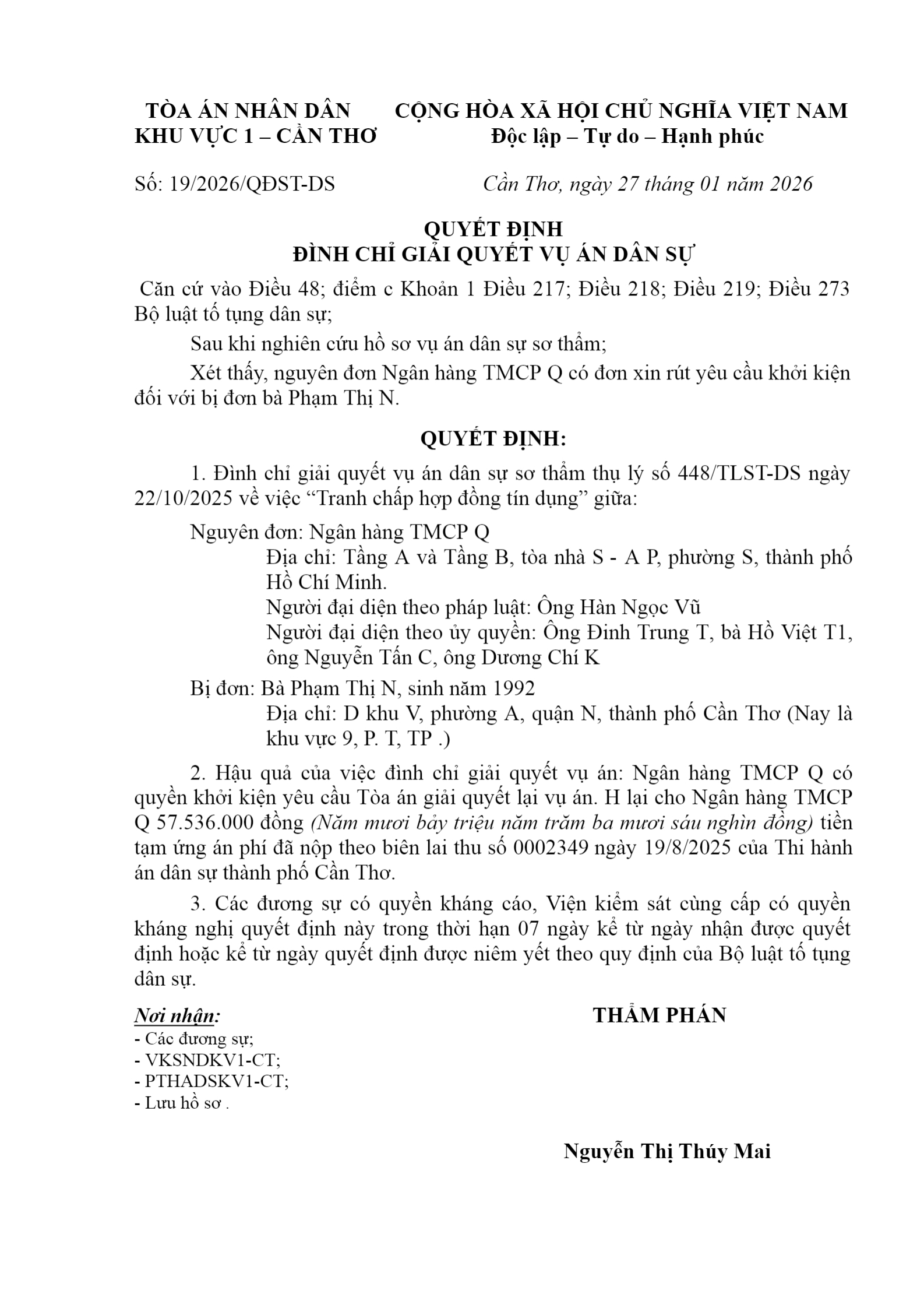 Quyết định số 19/2026/QĐST-DS ngày 27/01/2026 của Tòa án nhân dân khu vực 1 - Cần Thơ, TP. Cần Thơ về tranh chấp hợp đồng tín dụng