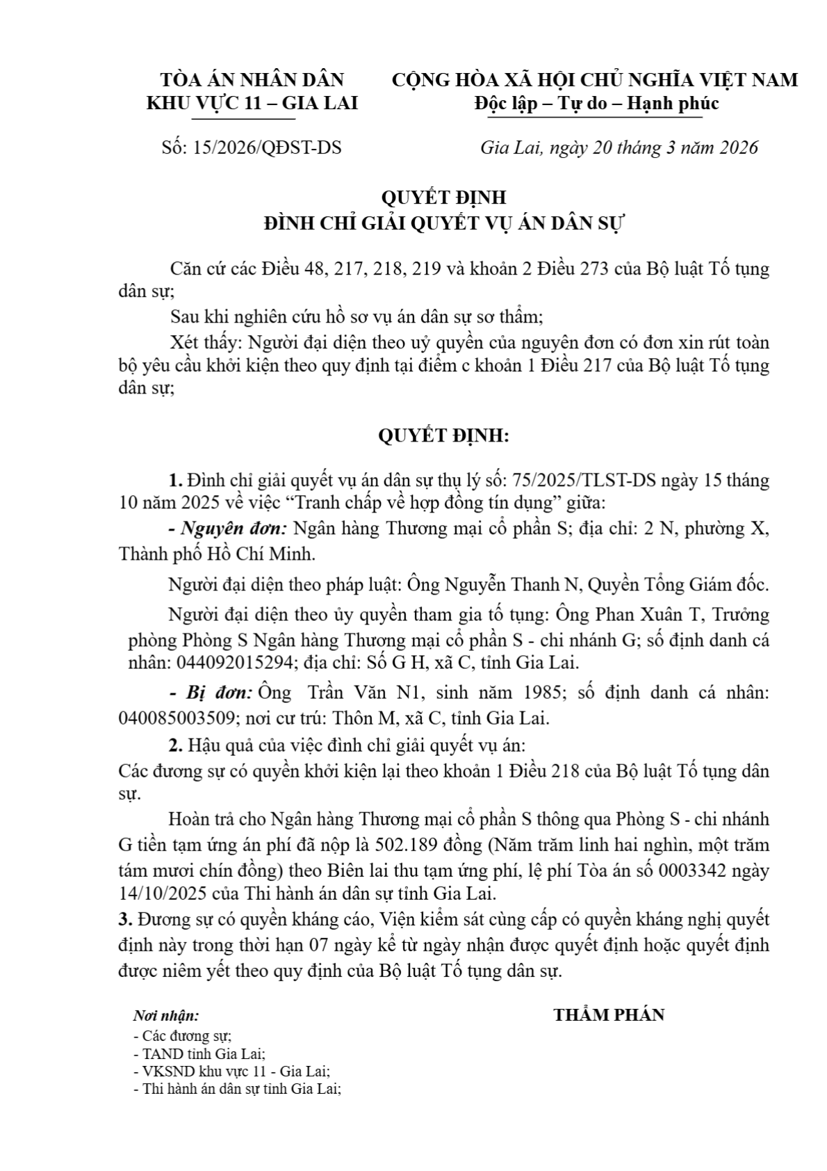 | Tòa án xét xử: | Tòa án nhân dân khu vực 11 - Gia Lai, tỉnh Gia Lai |