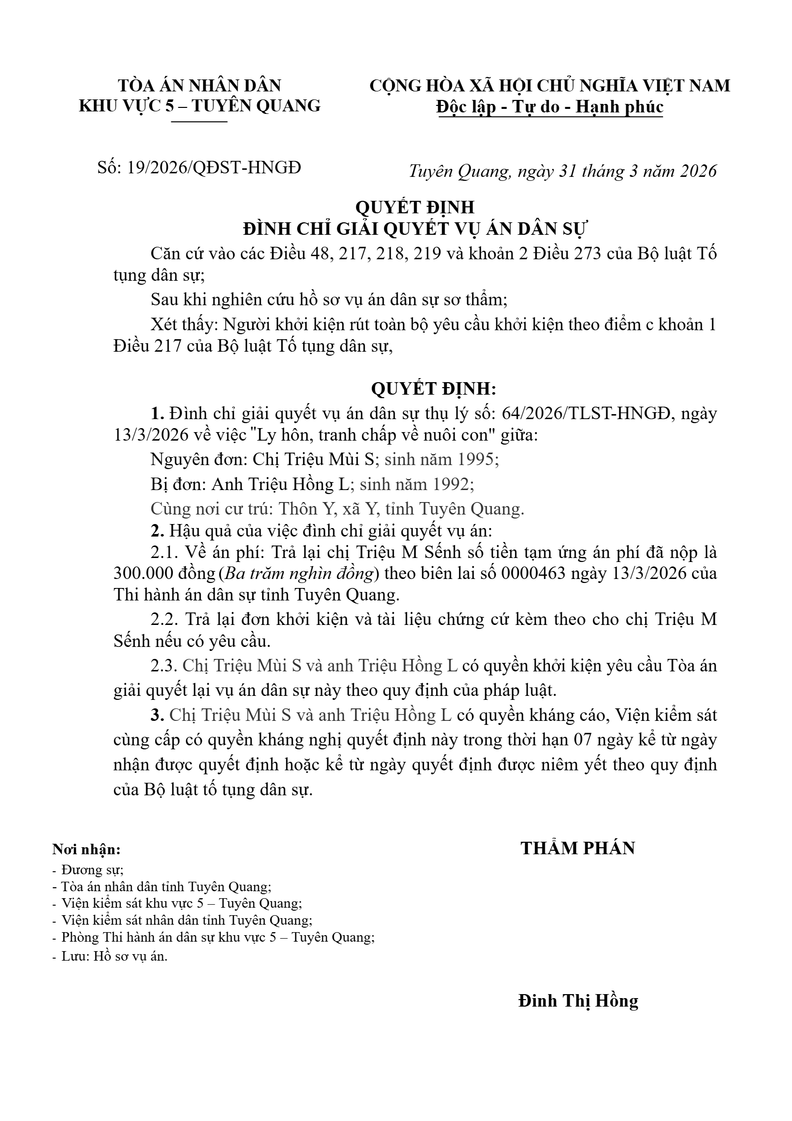 Quyết định số 19/2026/QĐST-HNGĐ ngày 31/03/2026 của Tòa án nhân dân khu vực 5 - Tuyên Quang, tỉnh Tuyên Quang về vụ án ly hôn về mâu thuẫn gia đình