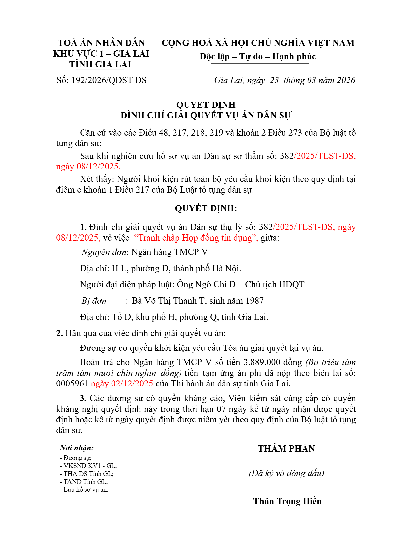Quyết định số 192/2026/QĐST-DS ngày 23/03/2026 của Tòa án nhân dân khu vực 1 - Gia Lai, tỉnh Gia Lai về tranh chấp hợp đồng tín dụng