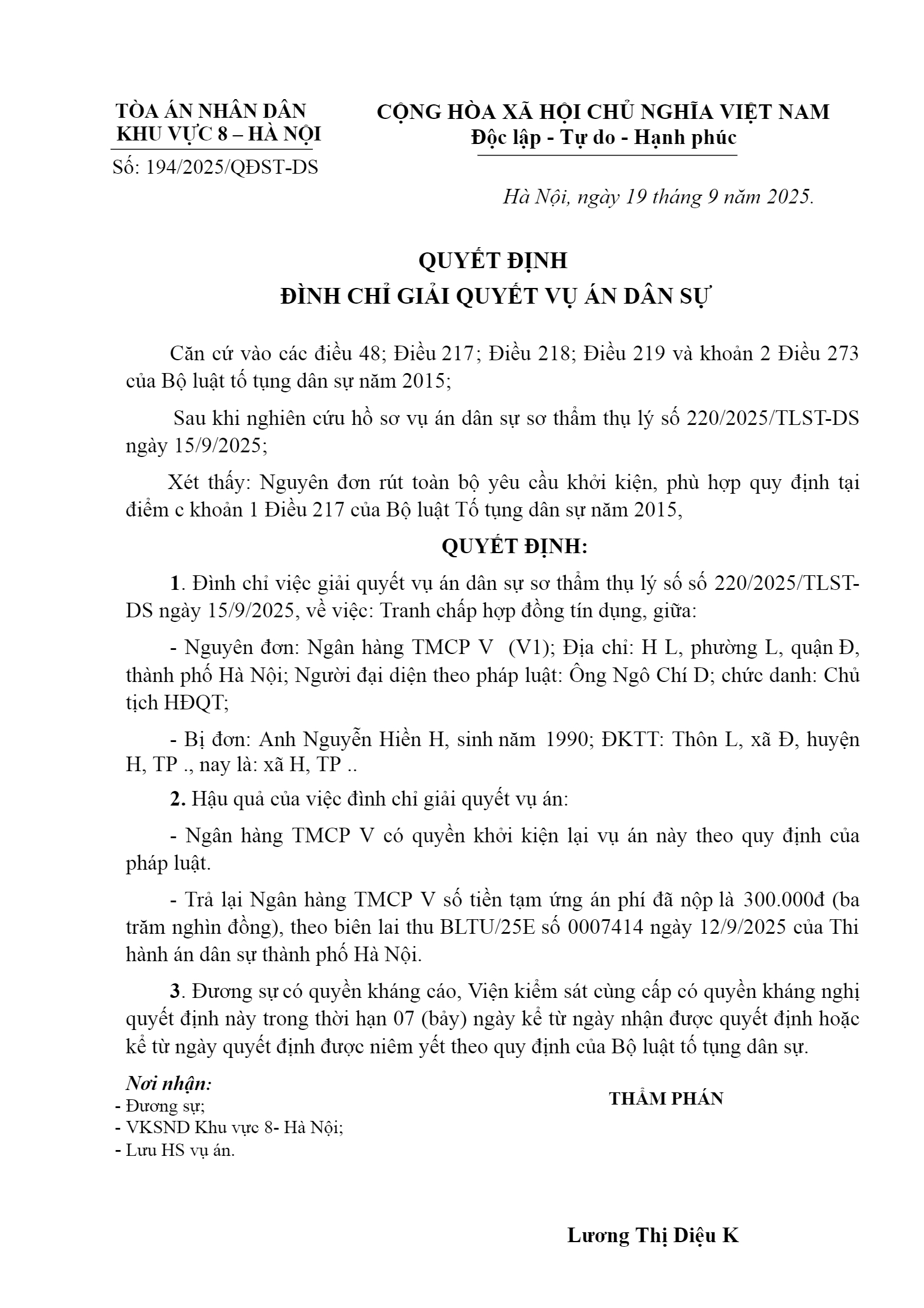 Quyết định số 194/2025/QĐST-DS ngày 19/09/2025 của Tòa án nhân dân khu vực 8 - Hà Nội, TP. Hà Nội về tranh chấp hợp đồng tín dụng