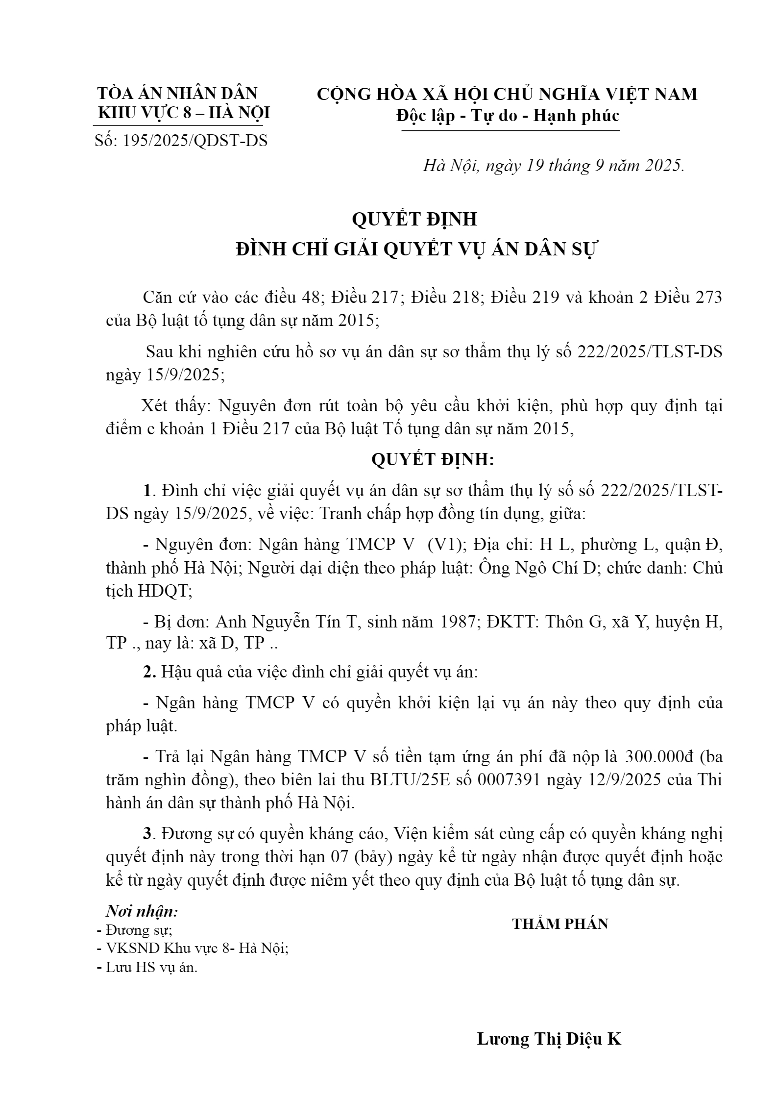 Quyết định số 195/2025/QĐST-DS ngày 19/09/2025 của Tòa án nhân dân khu vực 8 - Hà Nội, TP. Hà Nội về tranh chấp hợp đồng tín dụng