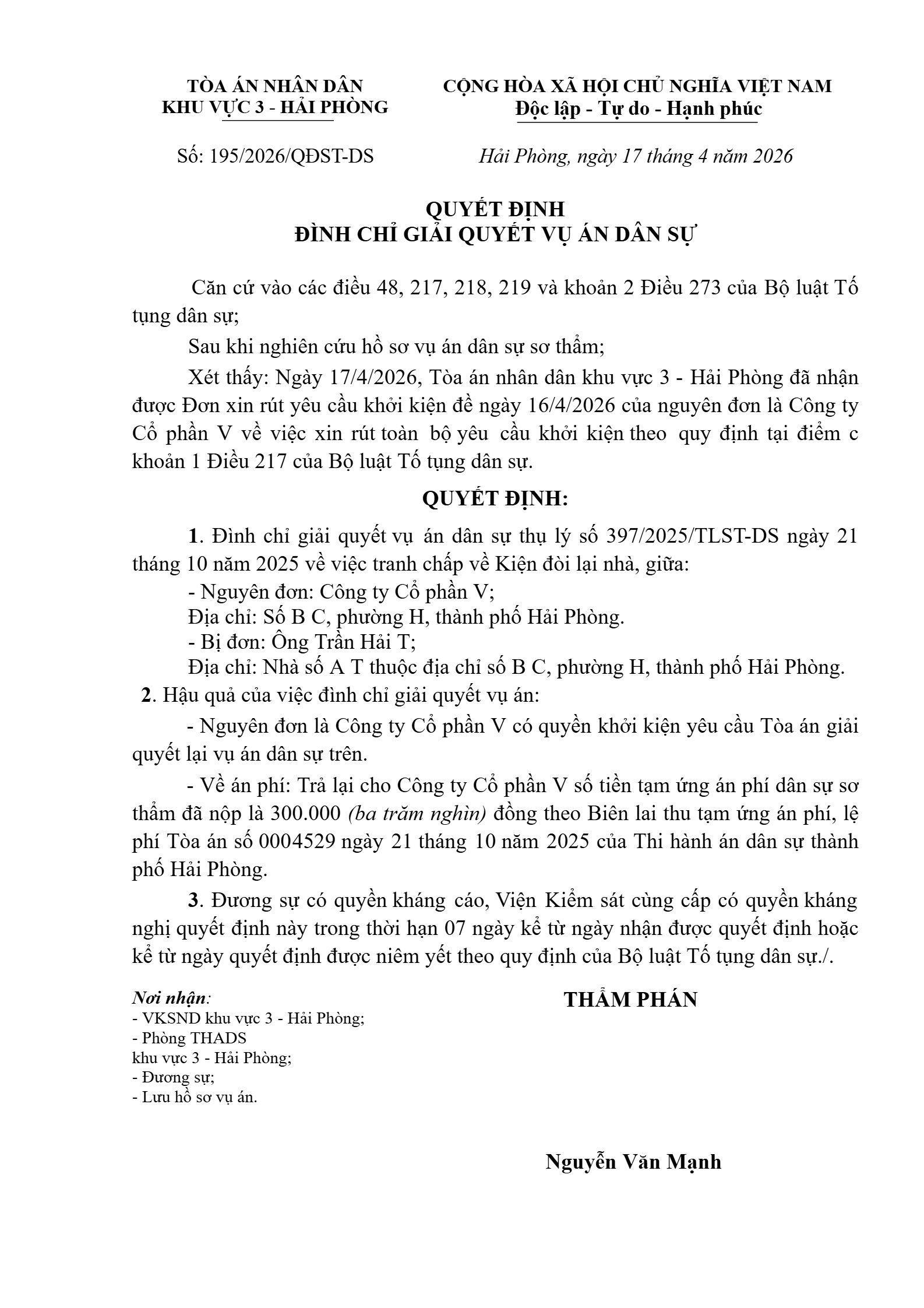 Quyết định số 195/2026/QĐST-DS ngày 17/04/2026 của Tòa án nhân dân khu vực 3 - Hải Phòng, TP. Hải Phòng về tranh chấp về quyền sở hữu và các quyền khác đối với tài sản
