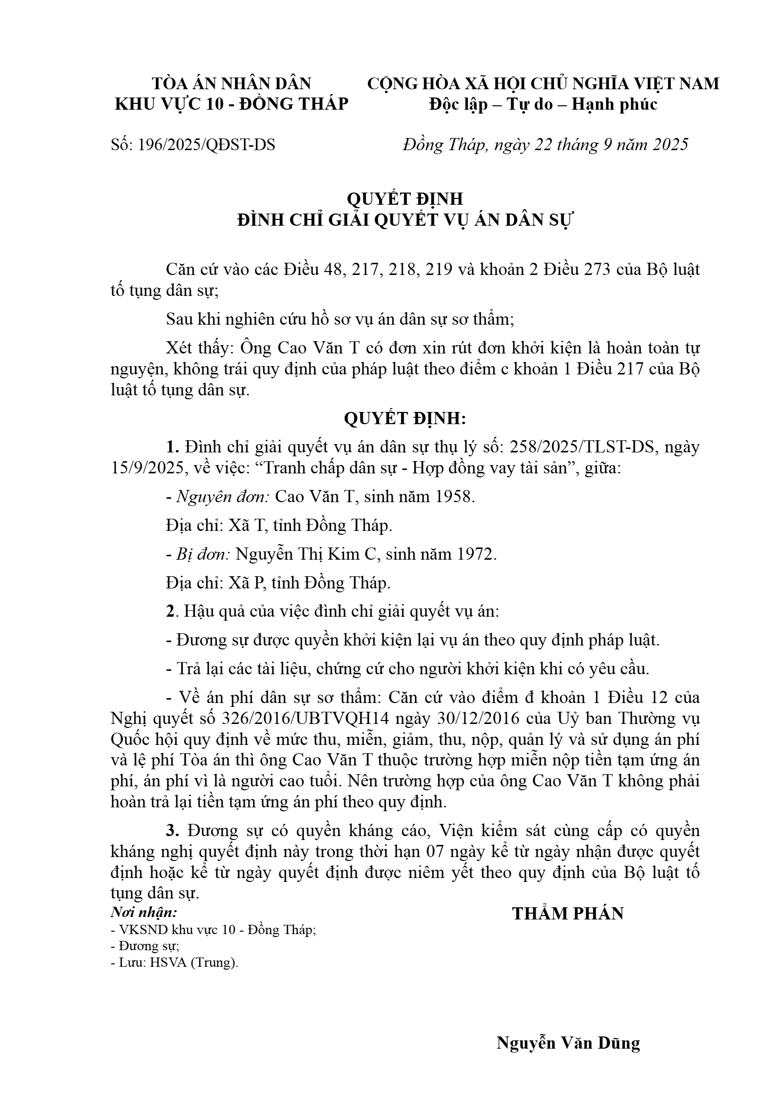Quyết định số 196/2025/QĐST-DS ngày 22/09/2025 của Tòa án nhân dân khu vực 10 - Đồng Tháp, tỉnh Đồng Tháp về tranh chấp hợp đồng vay tài sản