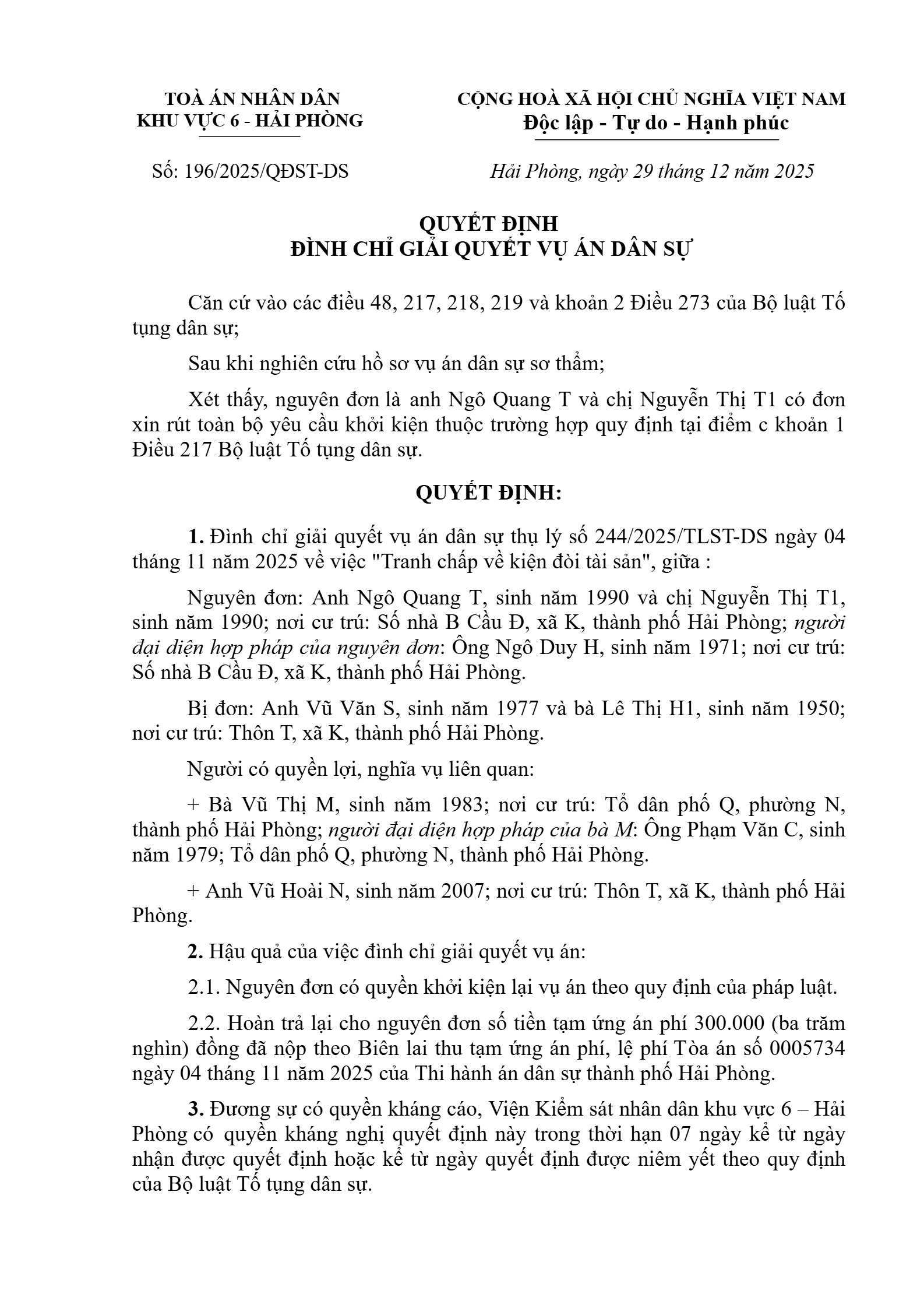 | Tên Quyết định: | Quyết định số 196/2025/QĐST-DS ngày 29/12/2025 của Tòa án nhân dân khu vực 6 - Hải Phòng, TP. Hải Phòng về tranh chấp quyền sử dụng đất |