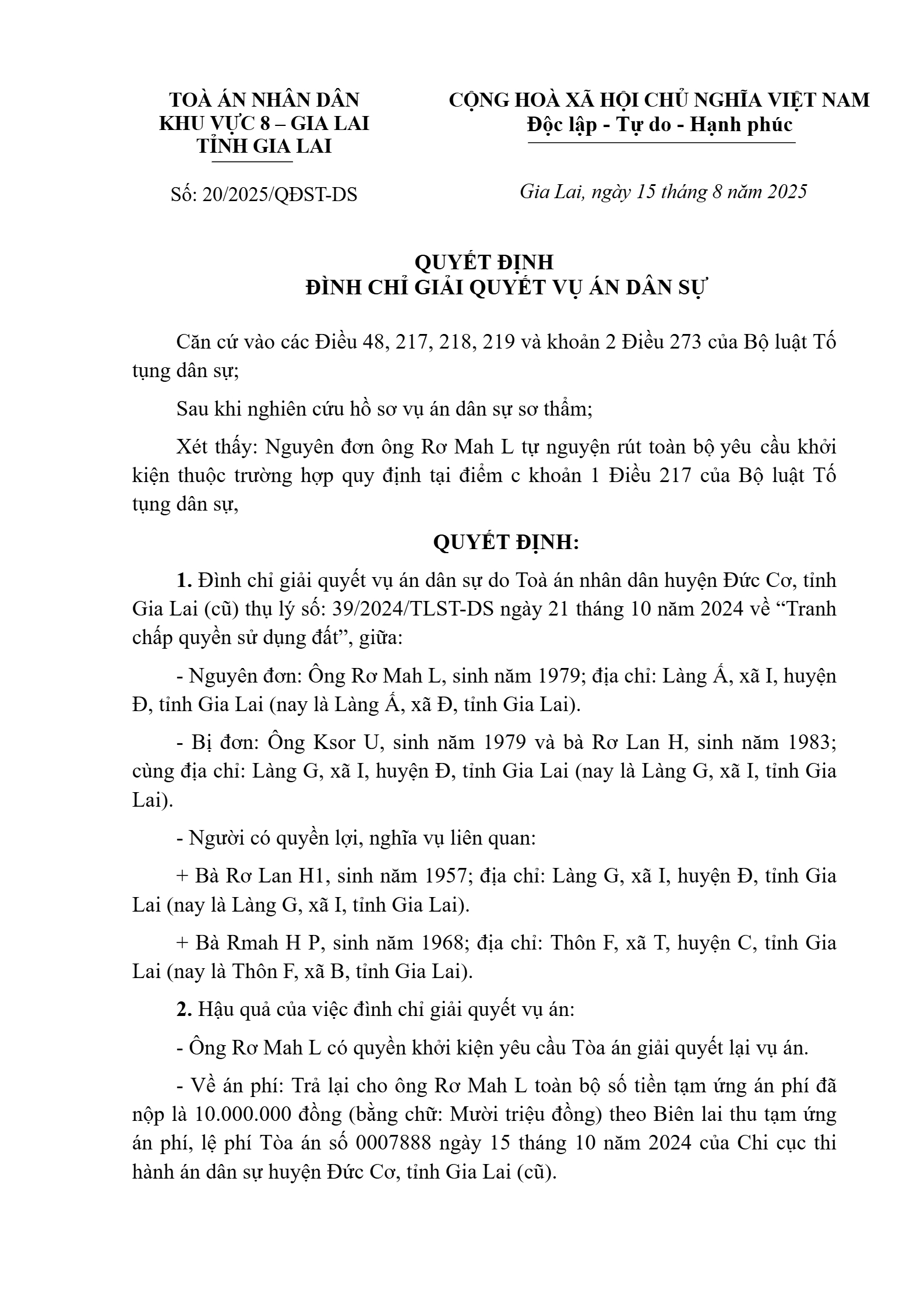 Quyết định số 20/2025/QĐST-DS ngày 29/09/2025 của Tòa án nhân dân khu vực 8 - Gia Lai, tỉnh Gia Lai về tranh chấp quyền sử dụng đất