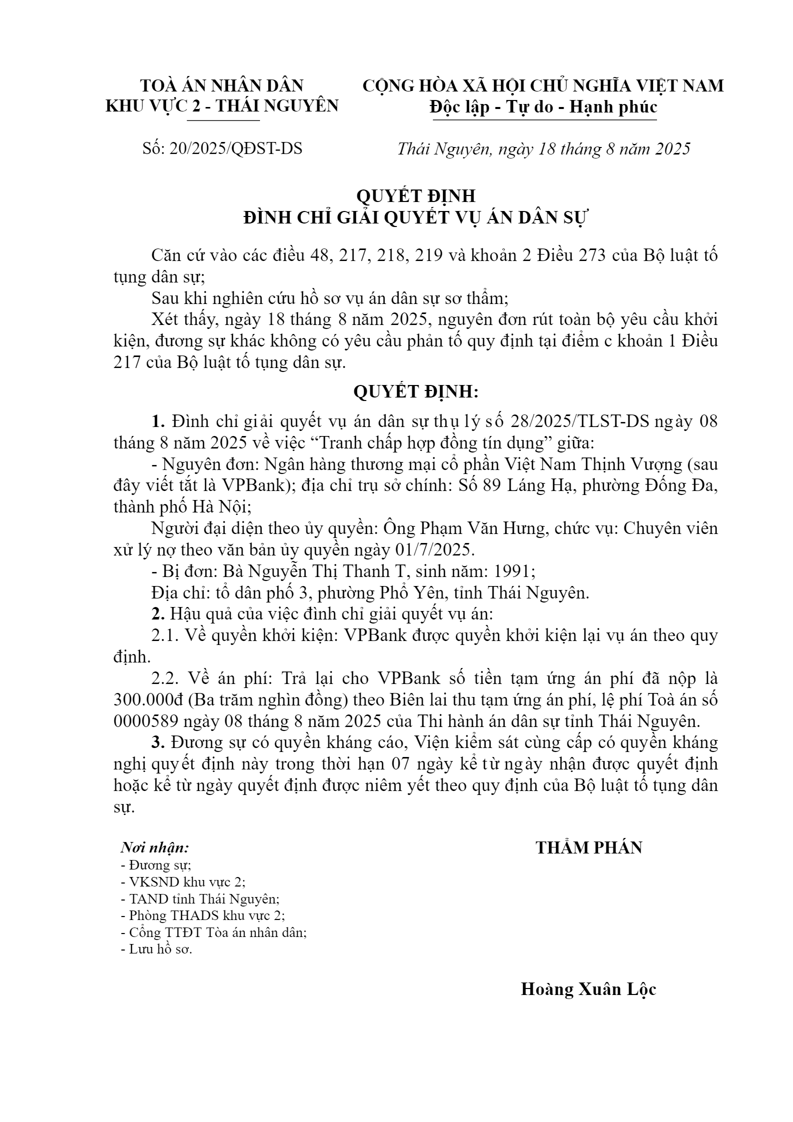 Quyết định số 20/2025/QĐST-DS ngày 18/08/2025 của TAND TX. Phổ Yên, tỉnh Thái Nguyên về tranh chấp hợp đồng tín dụng