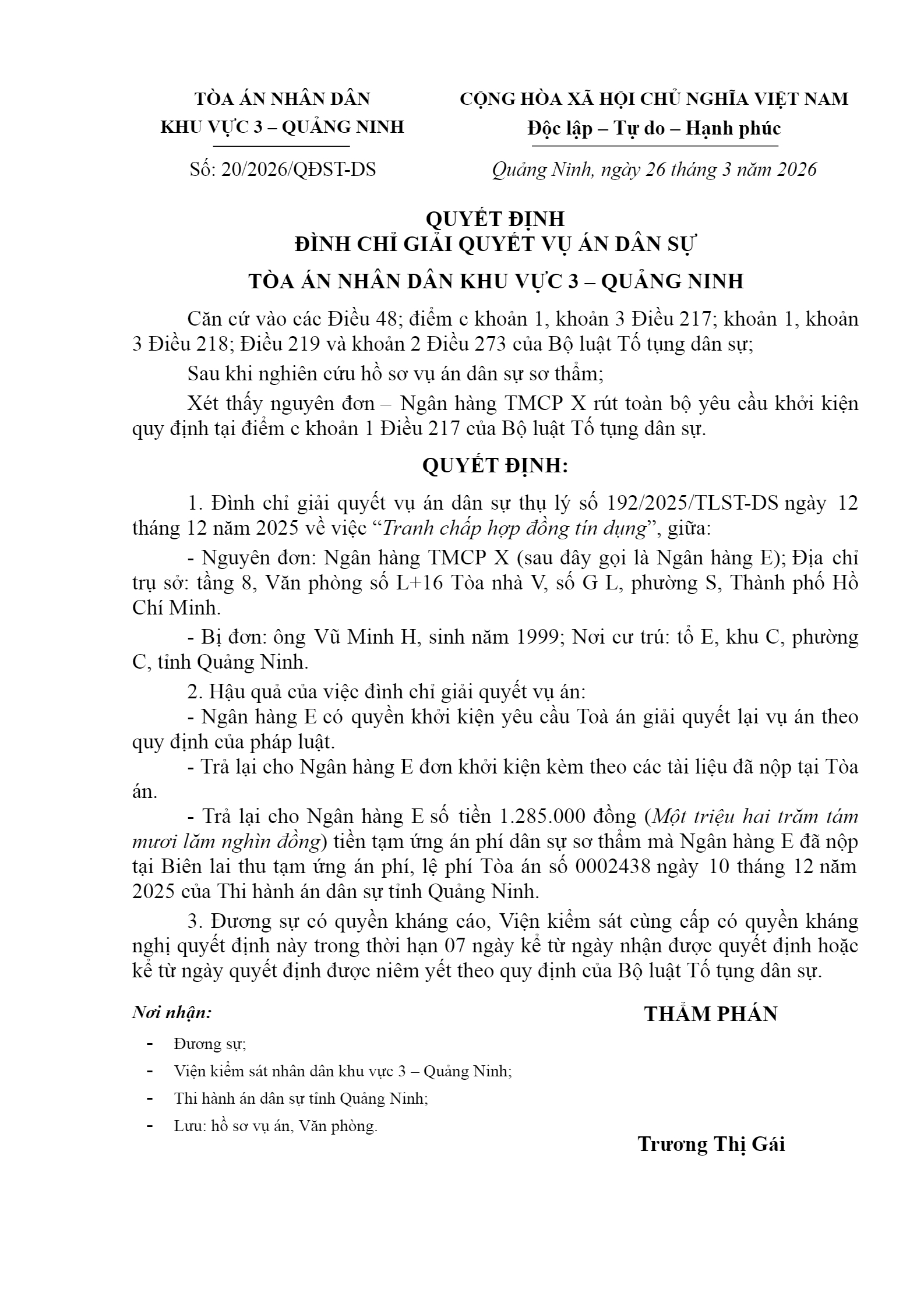 Quyết định số 20/2026/QĐST-DS ngày 26/03/2026 của Tòa án nhân dân khu vực 3 - Quảng Ninh, tỉnh Quảng Ninh về tranh chấp hợp đồng tín dụng