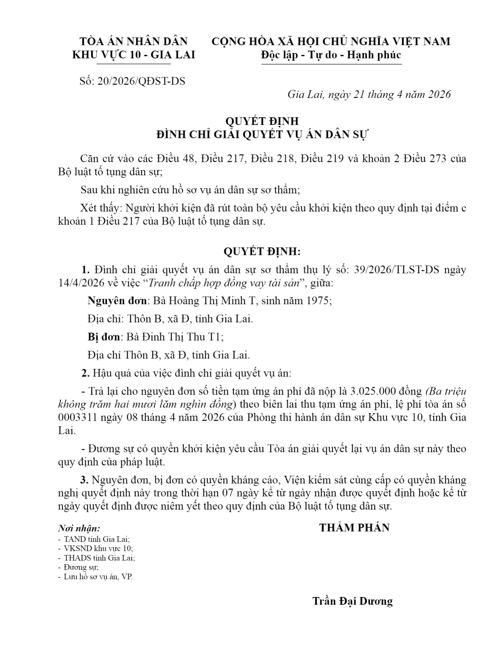 Quyết định số 20/2026/QĐST-DS ngày 21/04/2026 của Tòa án nhân dân khu vực 10 - Gia Lai, tỉnh Gia Lai về tranh chấp hợp đồng vay tài sản