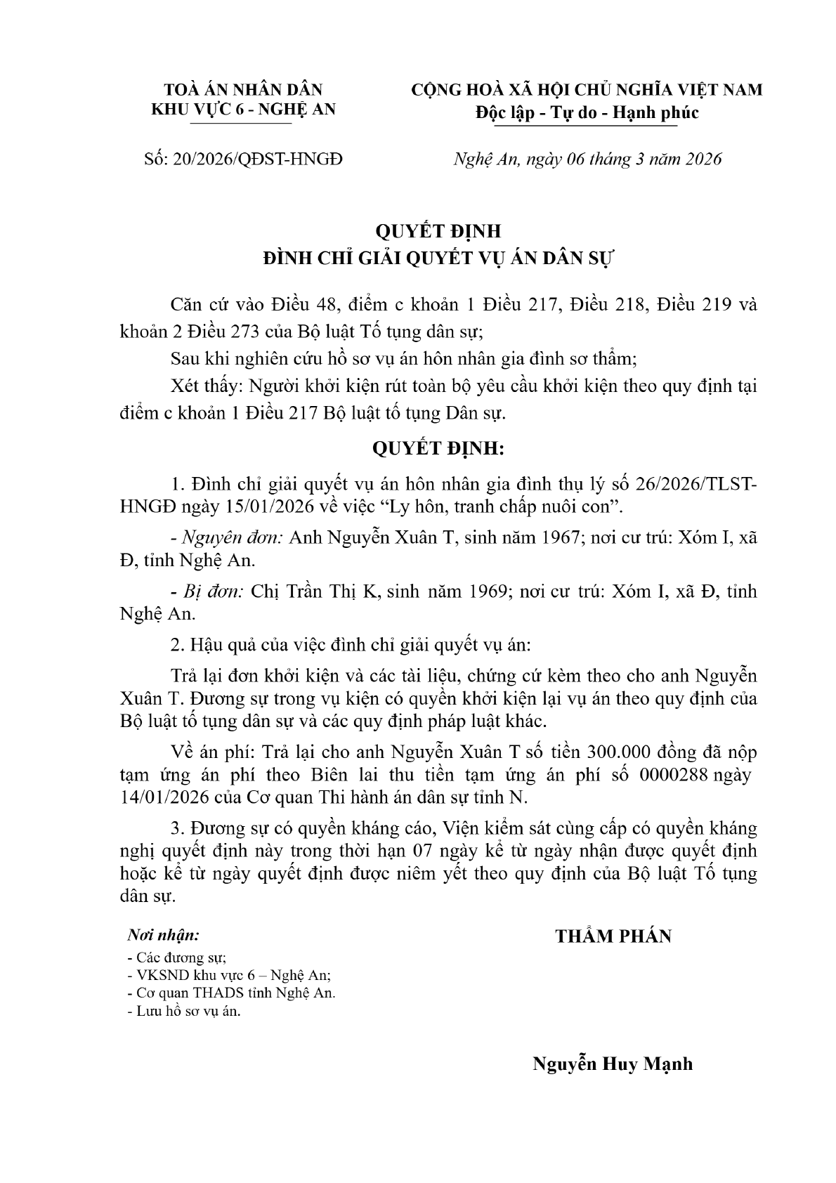 Quyết định số 20/2026/QĐST-HNGĐ ngày 06/03/2026 của Tòa án nhân dân khu vực 6 - Nghệ An, tỉnh Nghệ An về vụ án ly hôn về mâu thuẫn gia đình