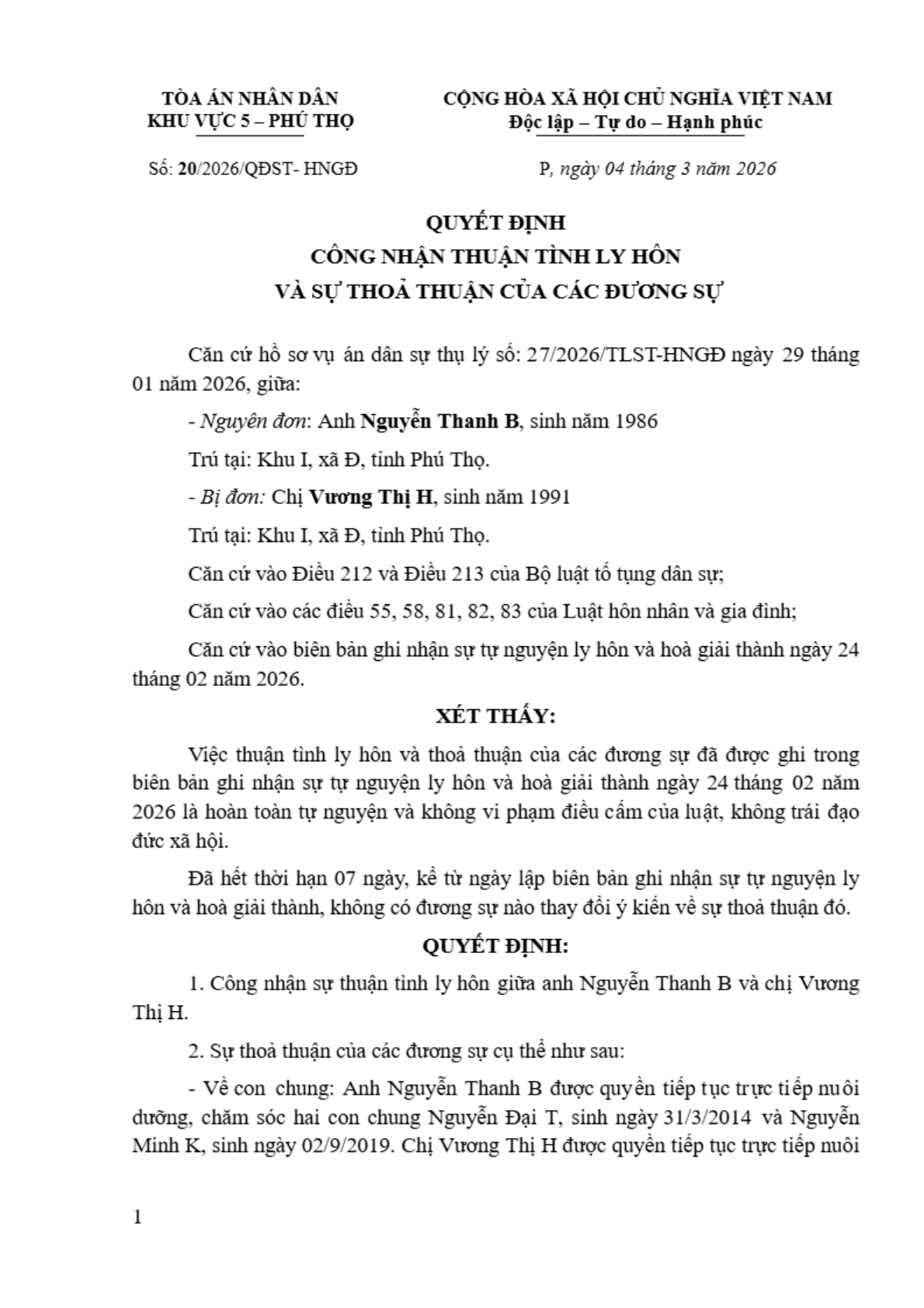 Quyết định số 20/2026/QĐST-HNGĐ