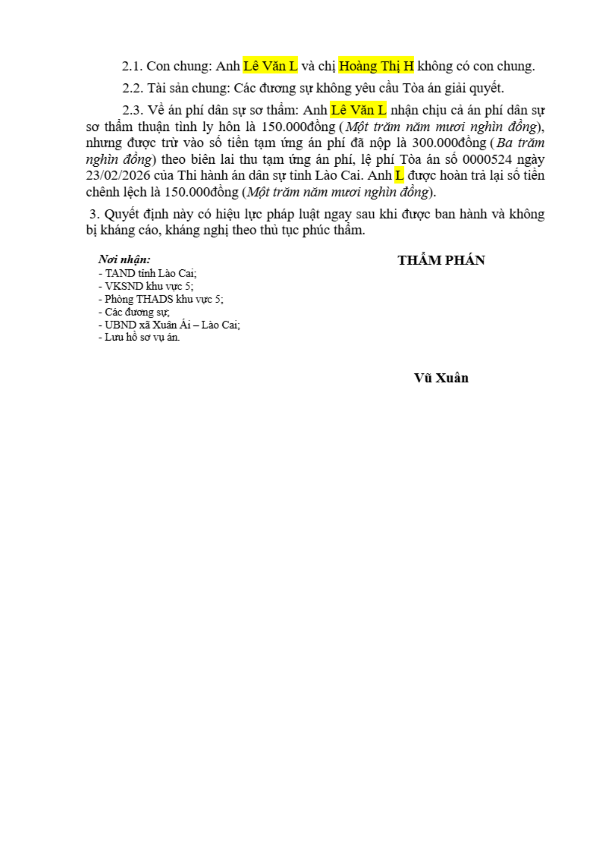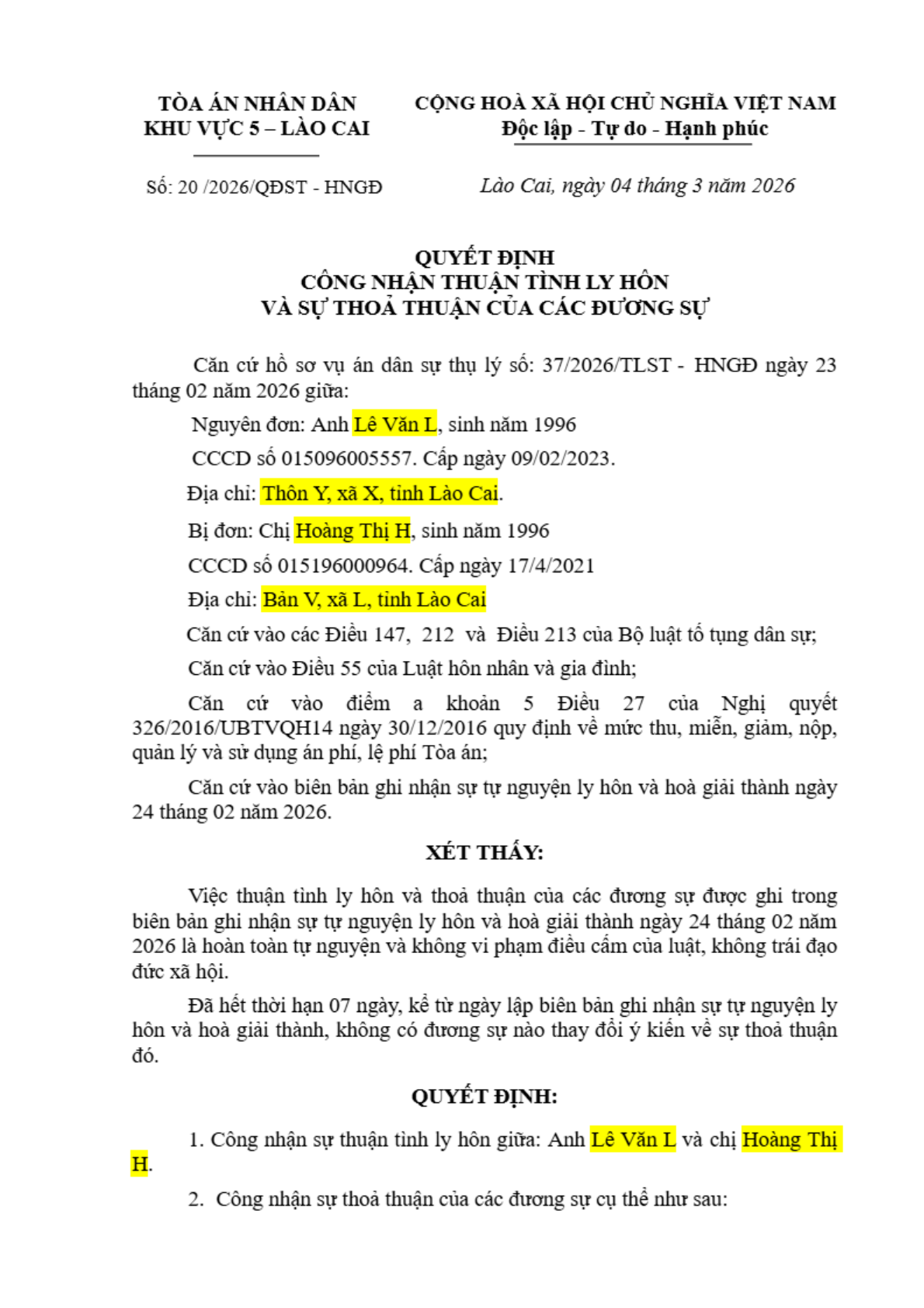 Quyết định số 20/2026/QĐST-HNGĐ ngày 04/03/2026 của Tòa án nhân dân khu vực 5 - Lào Cai, tỉnh Lào Cai về vụ án ly hôn về bệnh tật, không có con