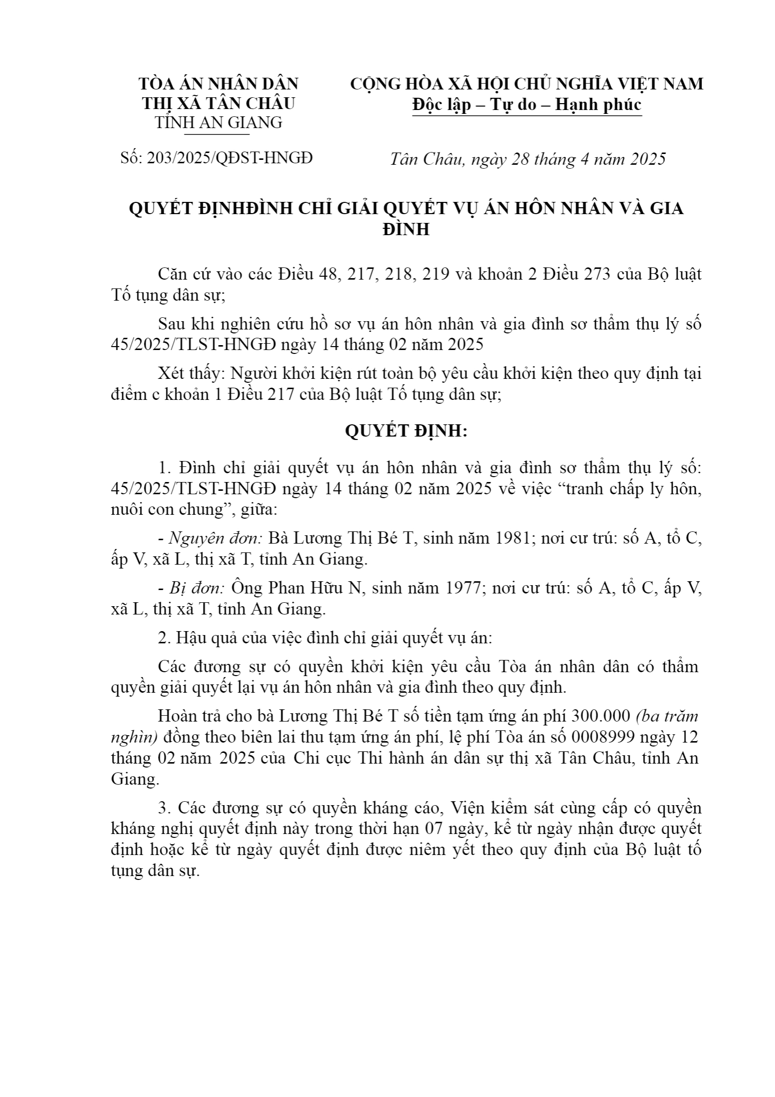 Quyết định số 203/2025/QĐST-HNGĐ ngày 28/04/2025 của TAND TX. Tân Châu, tỉnh An Giang về vụ án ly hôn về mâu thuẫn gia đình