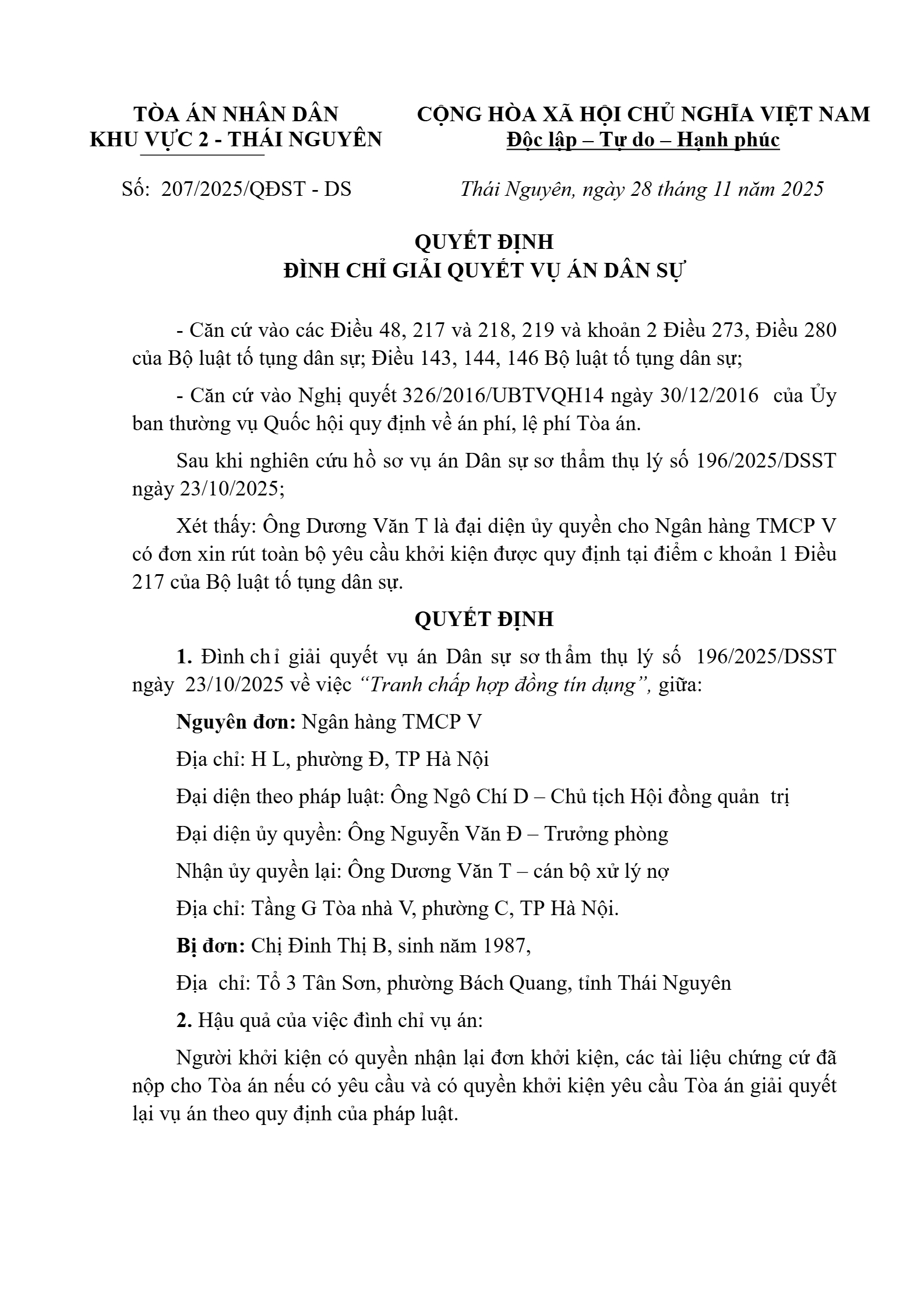Quyết định số 207/2025/QĐST-DS ngày 28/11/2025 của Tòa án nhân dân khu vực 2 - Thái Nguyên, tỉnh Thái Nguyên về tranh chấp hợp đồng tín dụng
