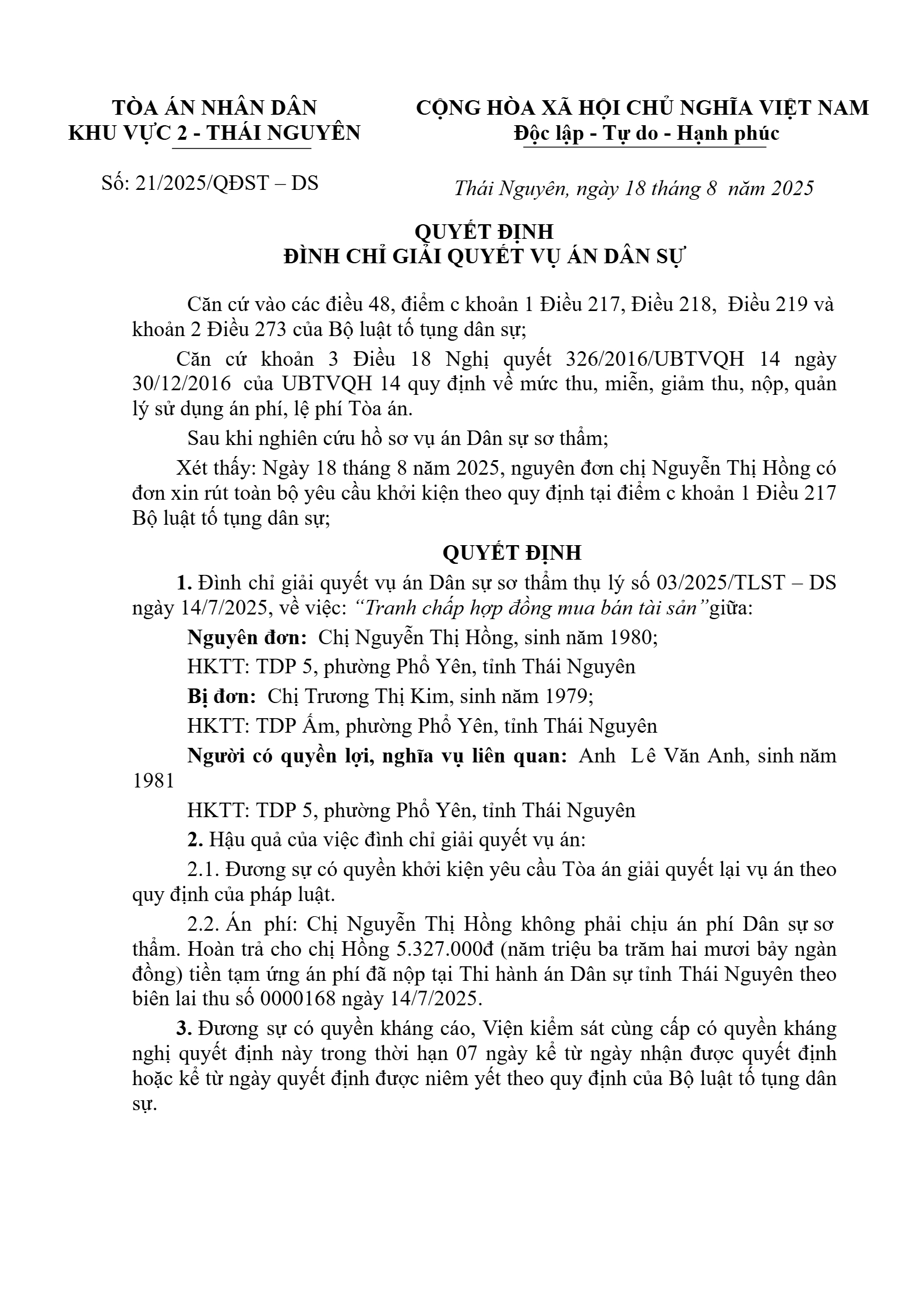 Quyết định số 21/2025/QĐST-DS ngày 18/08/2025 của Tòa án nhân dân khu vực 2 - Thái Nguyên, tỉnh Thái Nguyên về tranh chấp về quyền sở hữu và các quyền khác đối với tài sản về quyền sở hữu tài sản