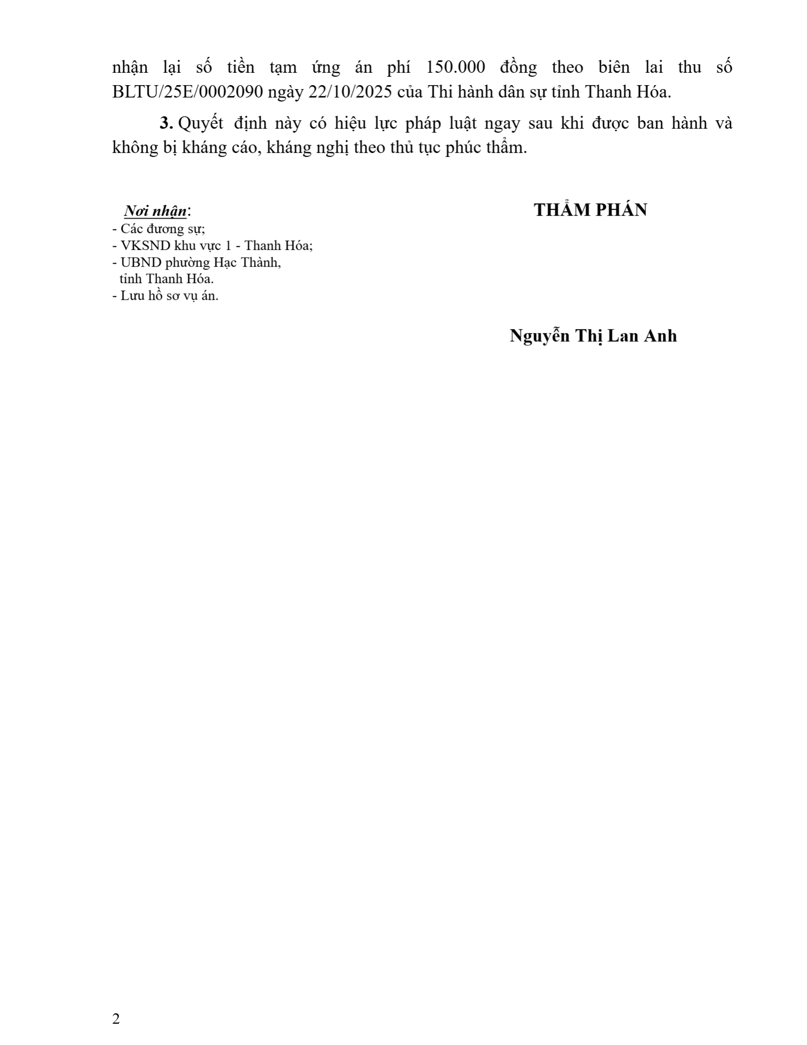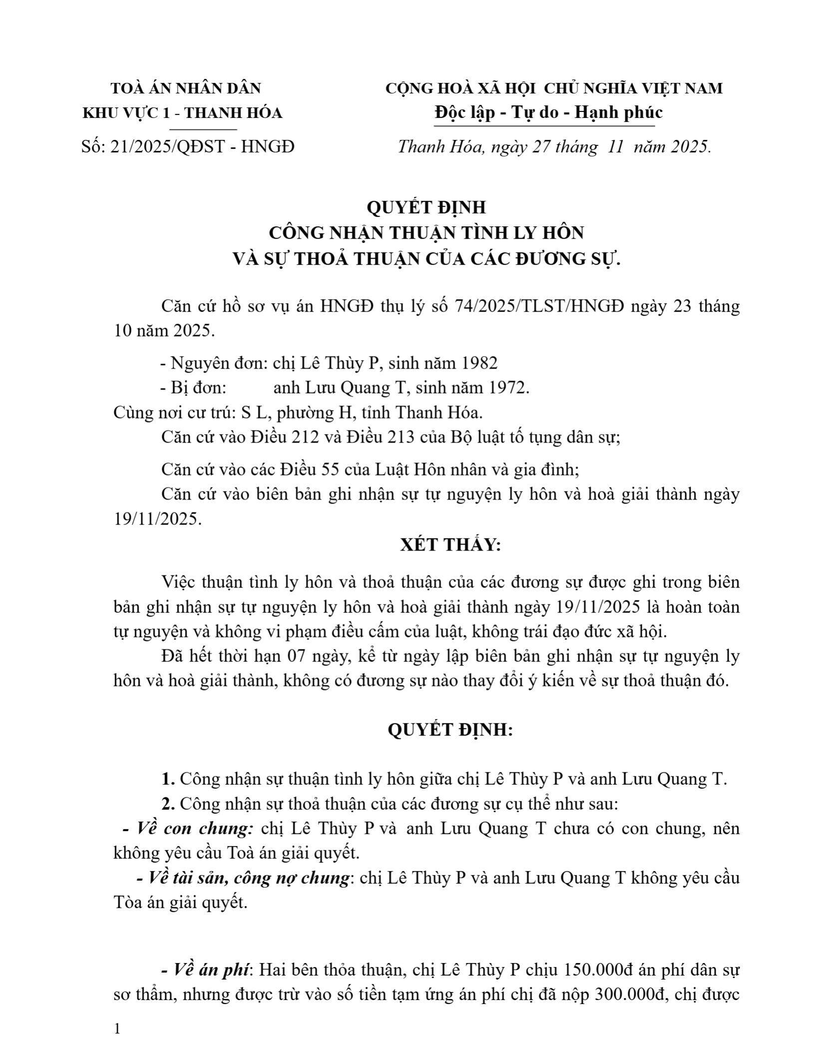 Quyết định số 21/2025/QĐST-HNGĐ ngày 27/11/2025 của Tòa án nhân dân khu vực 1 - Thanh Hóa, tỉnh Thanh Hóa về vụ án ly hôn về mâu thuẫn gia đình