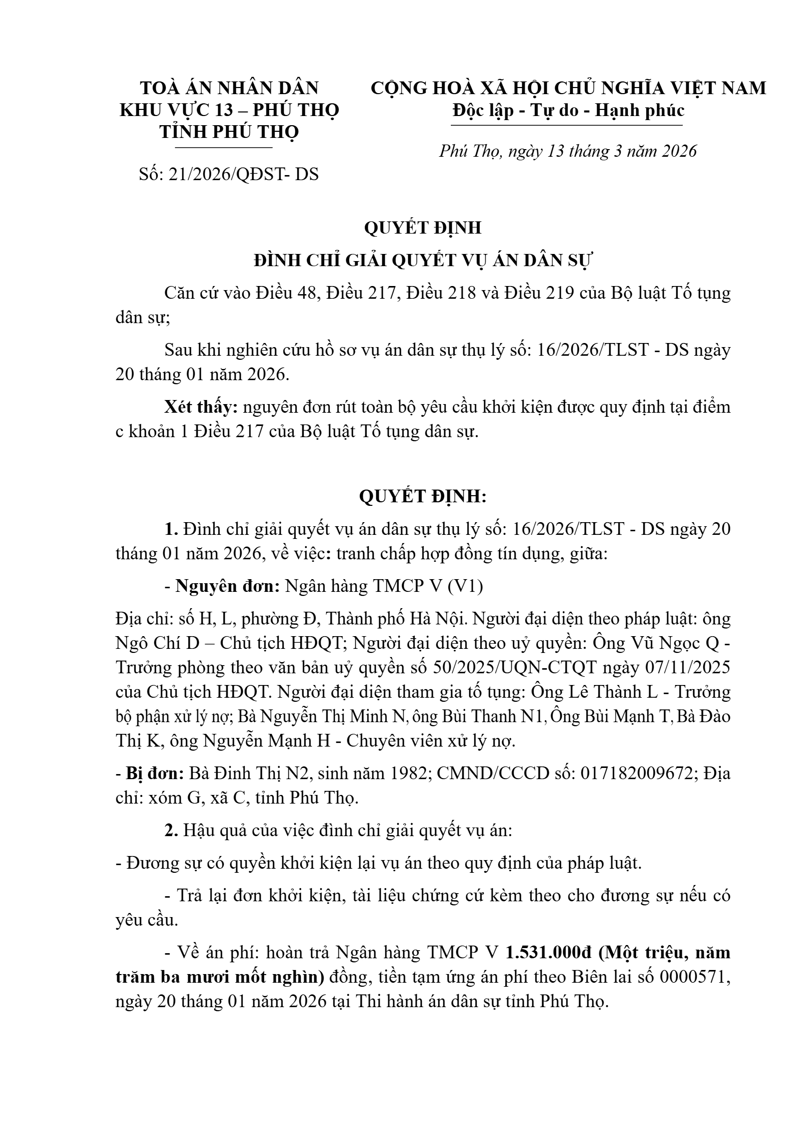 Quyết định số 21/2026/QĐST-DS ngày 13/03/2026 của Tòa án nhân dân khu vực 13 - Phú Thọ, tỉnh Phú Thọ về tranh chấp hợp đồng tín dụng