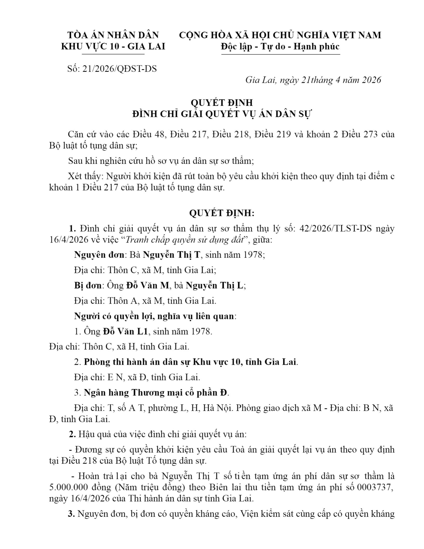 Quyết định số 21/2026/QĐST-DS ngày 21/04/2026 của Tòa án nhân dân khu vực 10 - Gia Lai, tỉnh Gia Lai về tranh chấp quyền sử dụng đất