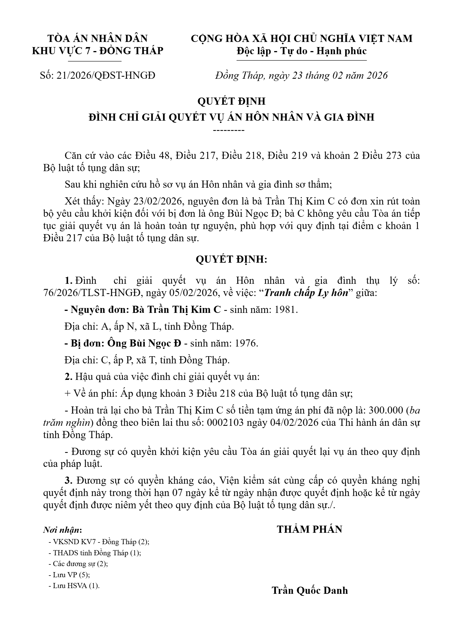 Quyết định số 21/2026/QĐST-HNGĐ ngày 23/02/2026 của Tòa án nhân dân khu vực 7 - Đồng Tháp, tỉnh Đồng Tháp về vụ án ly hôn về mâu thuẫn gia đình
