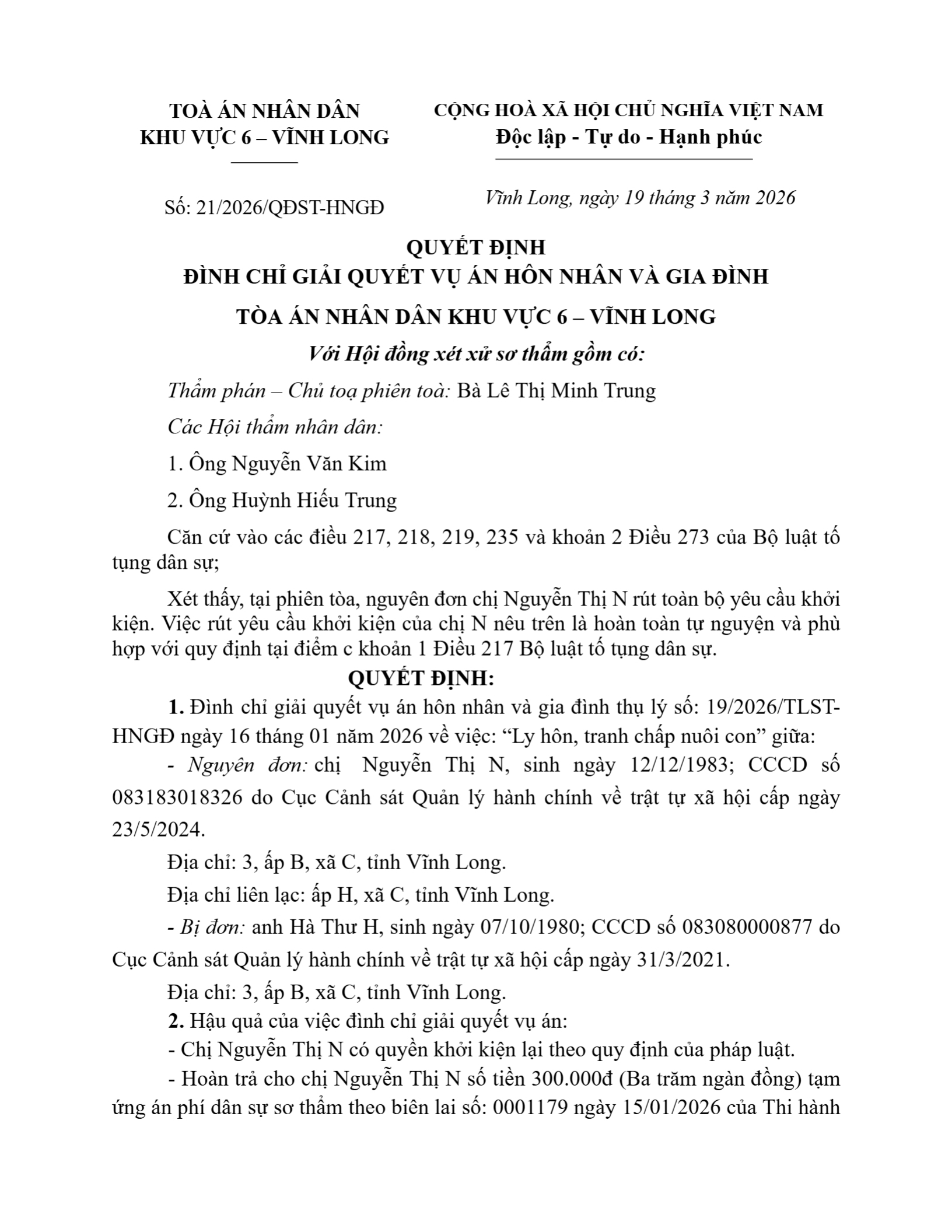 Quyết định số 21/2026/QĐST-HNGĐ ngày 19/03/2026 của Tòa án nhân dân khu vực 6 - Vĩnh Long, tỉnh Vĩnh Long về vụ án ly hôn về mâu thuẫn gia đình