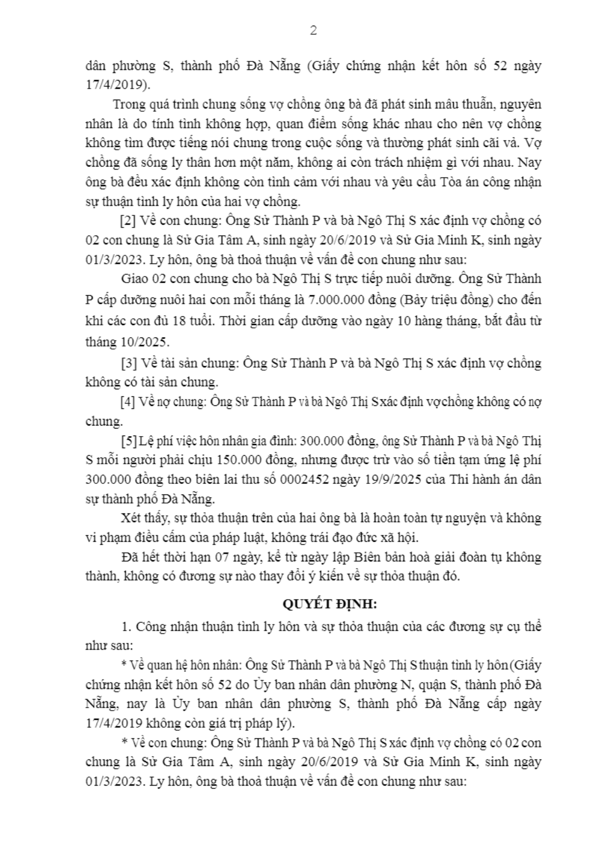 | Thông tin về vụ/việc: | Công nhận thuận tình ly hôn giữa Sử Thành P và Ngô Thị S |