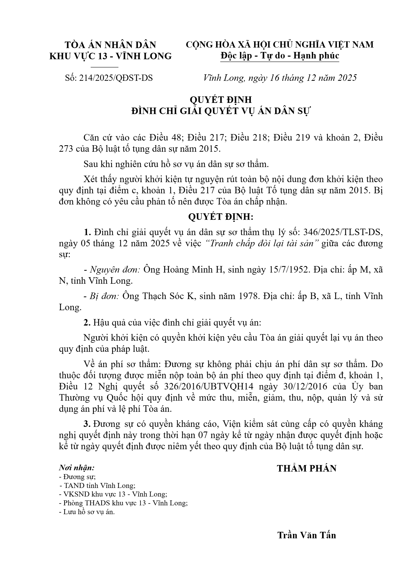 Quyết định số 214/2025/QĐST-DS ngày 16/12/2025 của Tòa án nhân dân khu vực 13 - Vĩnh Long, tỉnh Vĩnh Long về tranh chấp hợp đồng vay tài sản