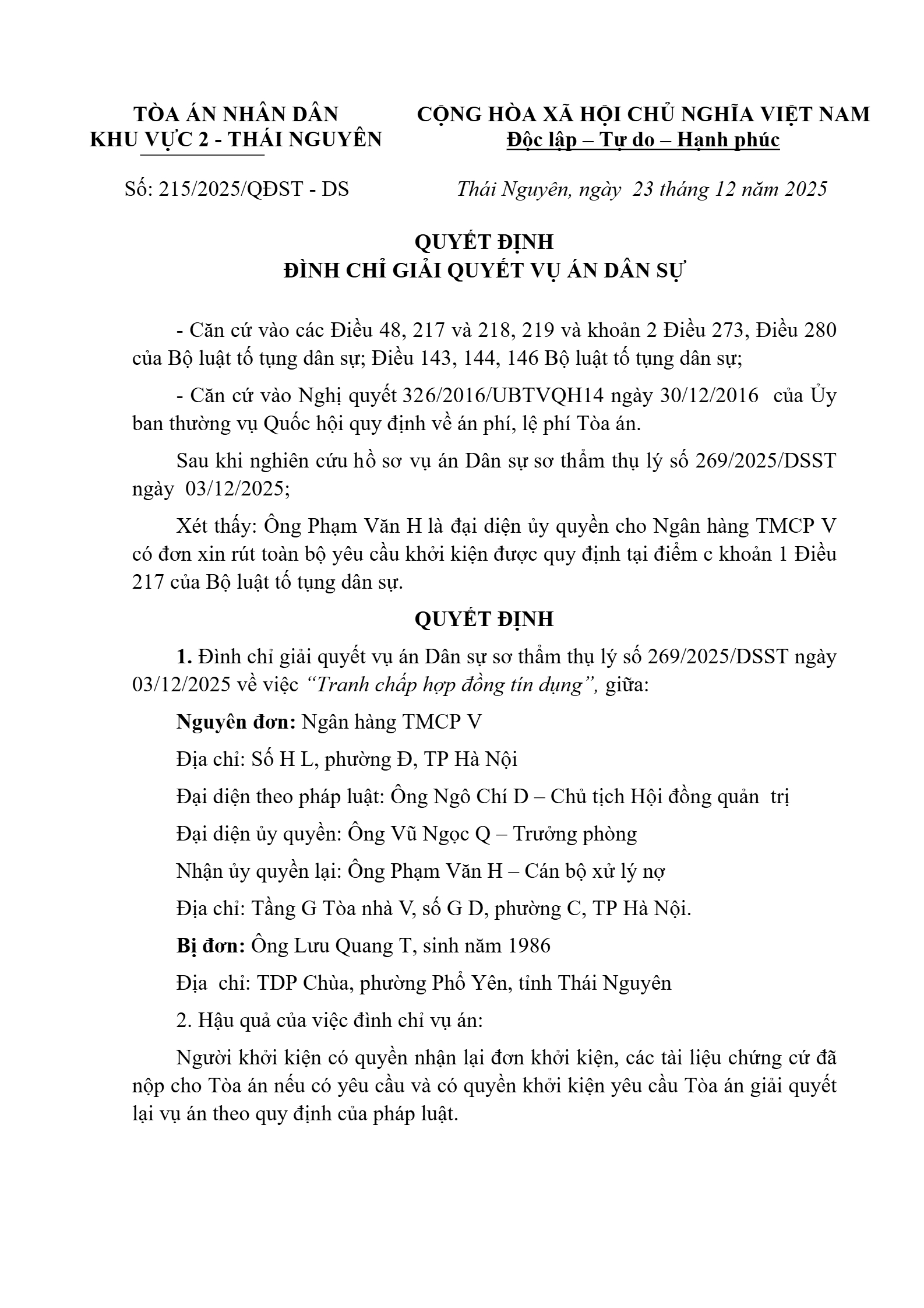 Quyết định số 215/2025/QĐST-DS ngày 23/12/2025 của Tòa án nhân dân khu vực 2 - Thái Nguyên, tỉnh Thái Nguyên về tranh chấp hợp đồng tín dụng