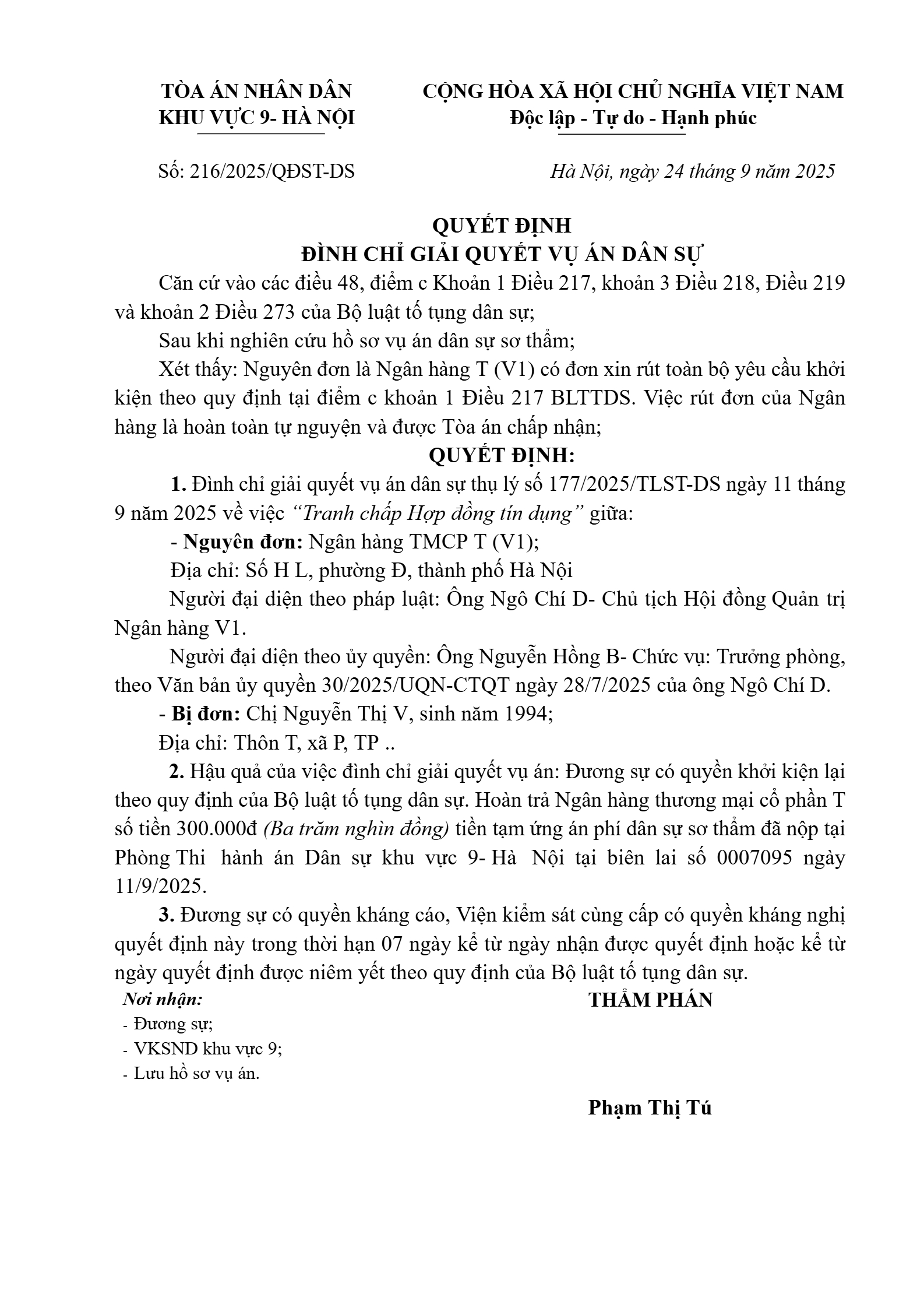 Quyết định số 216/2025/QĐST-DS ngày 24/09/2025 của Tòa án nhân dân khu vực 9 - Hà Nội, TP. Hà Nội về tranh chấp hợp đồng tín dụng