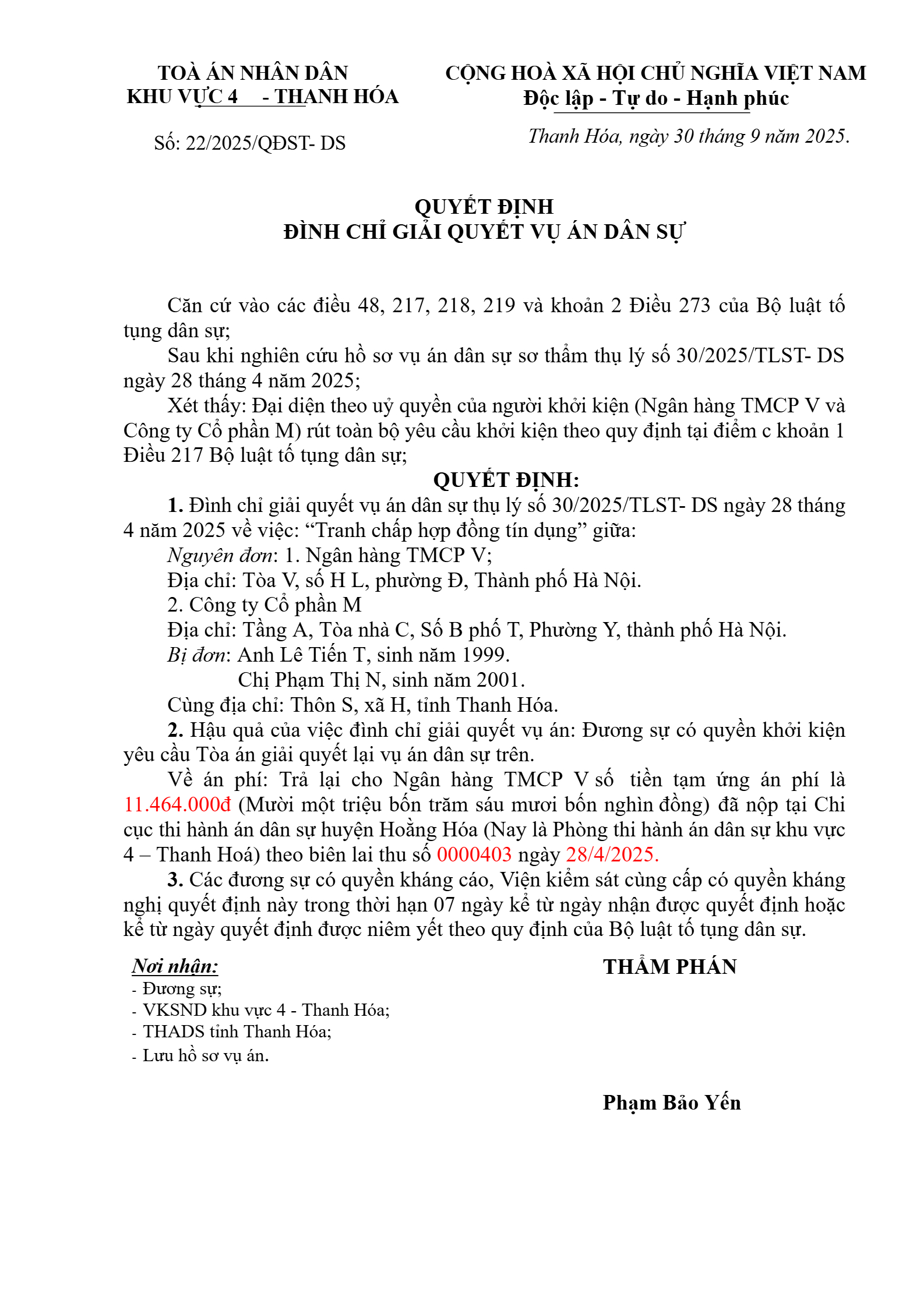 Quyết định số 22/2025/QĐST-DS ngày 30/09/2025 của Tòa án nhân dân khu vực 4 - Thanh Hóa, tỉnh Thanh Hóa về tranh chấp hợp đồng tín dụng