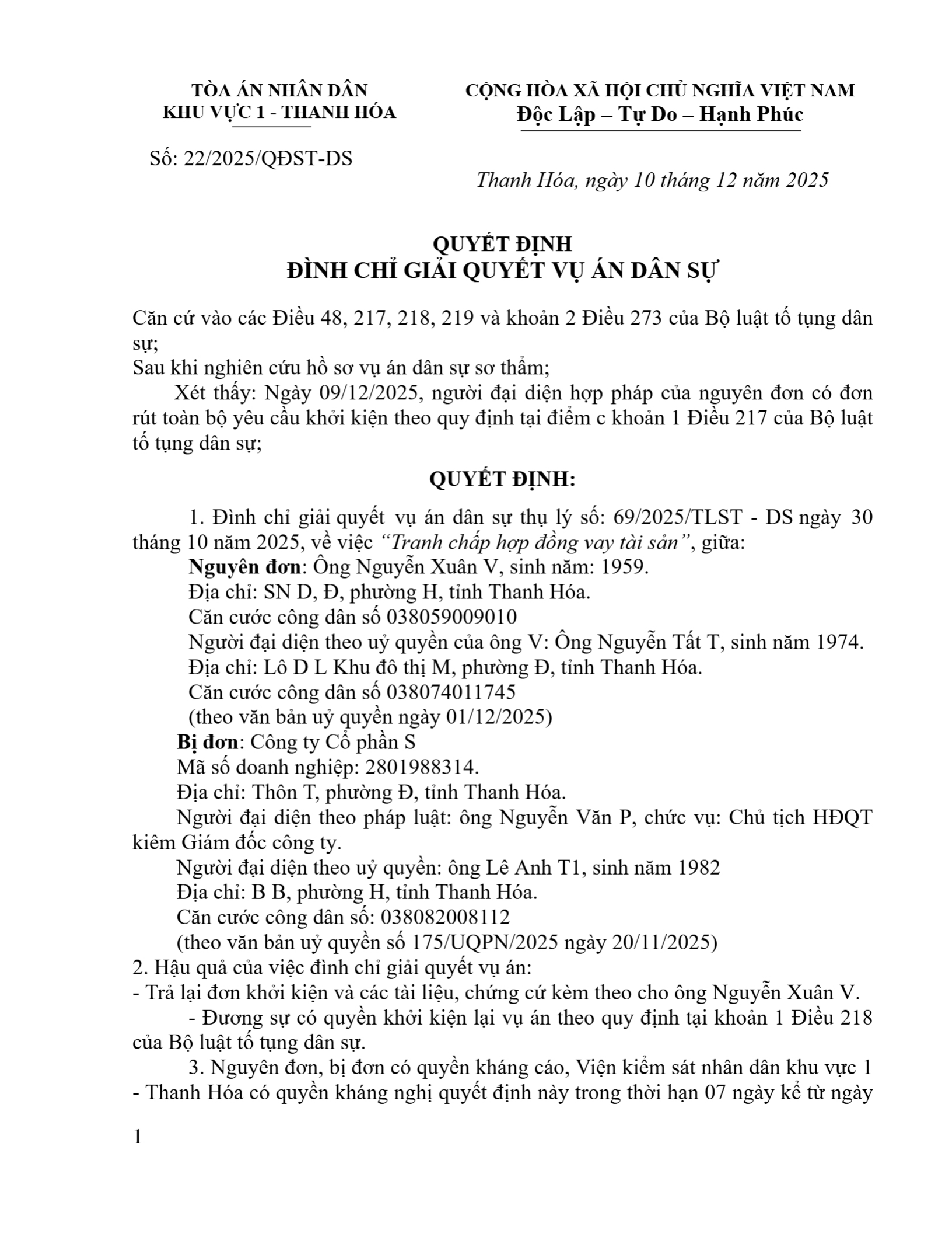 Quyết định số 22/2025/QĐST-DS ngày 10/12/2025 của Tòa án nhân dân khu vực 1 - Thanh Hóa, tỉnh Thanh Hóa về tranh chấp hợp đồng vay tài sản