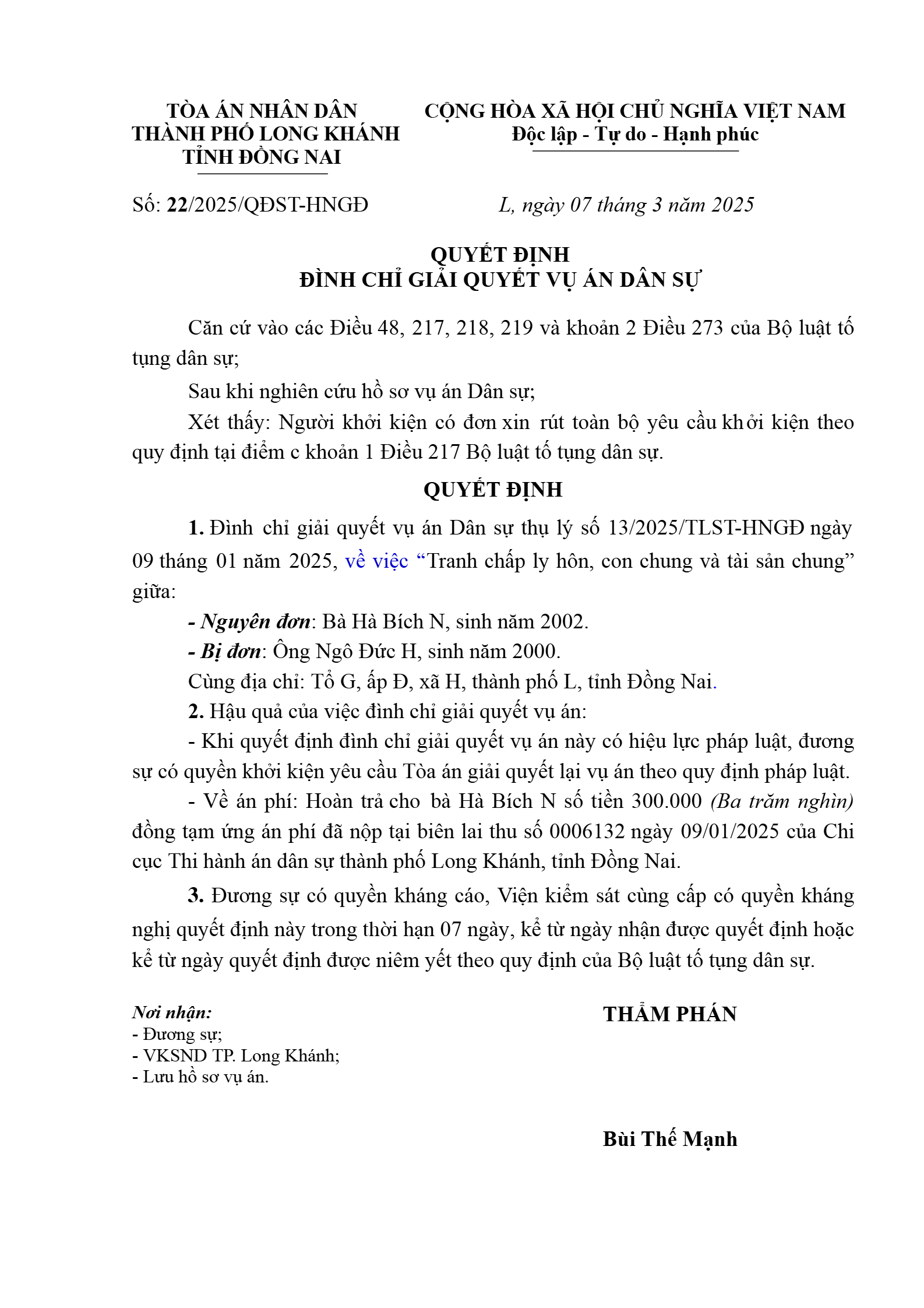 Quyết định số 22/2025/QĐST-HNGĐ ngày 07/03/2025 của TAND TX. Long Khánh, tỉnh Đồng Nai về vụ án ly hôn về mâu thuẫn gia đình