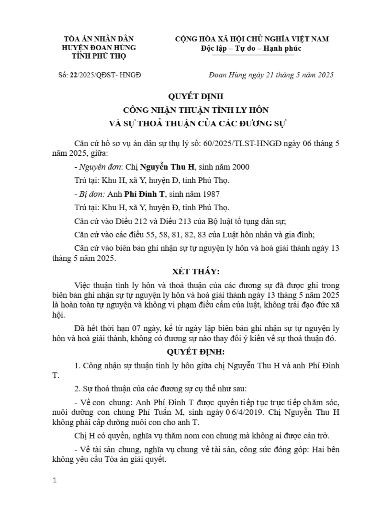 Quyết định số 22/2025/QĐST-HNGĐ ngày 21/05/2025 của TAND huyện Đoan Hùng, tỉnh Phú Thọ về vụ án ly hôn về mâu thuẫn gia đình