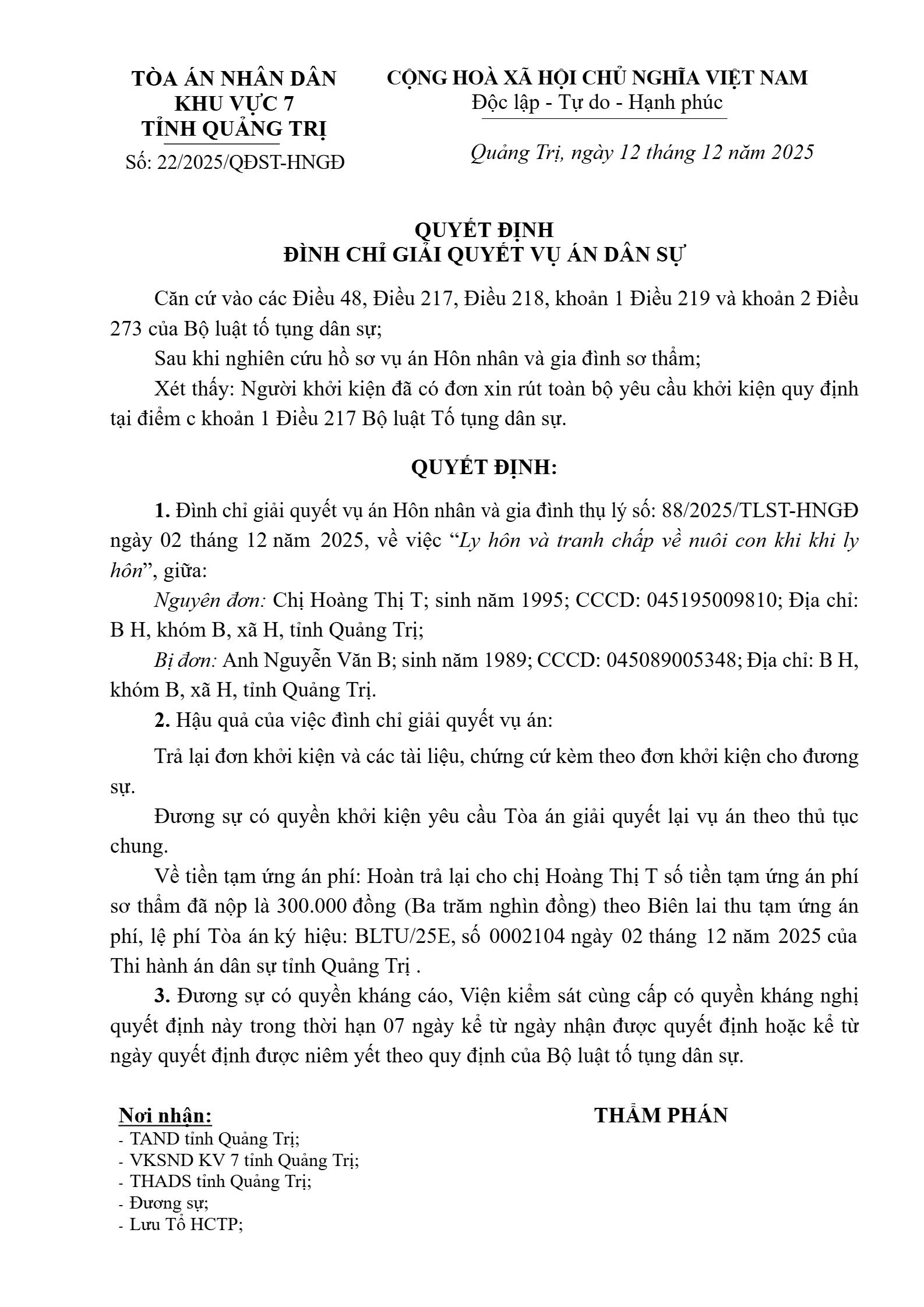 Quyết định số 22/2025/QĐST-HNGĐ ngày 12/12/2025 của Tòa án nhân dân khu vực 7 - Quảng Trị, tỉnh Quảng Trị về vụ án ly hôn về mâu thuẫn gia đình