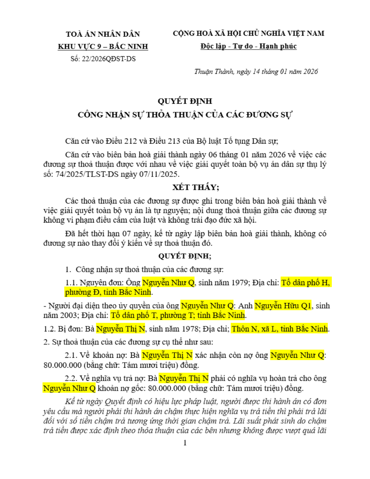Quyết định số 22/2026/QĐST-DS ngày 14/01/2026 của Tòa án nhân dân khu vực 9 - Bắc Ninh, tỉnh Bắc Ninh về tranh chấp hợp đồng vay tài sản