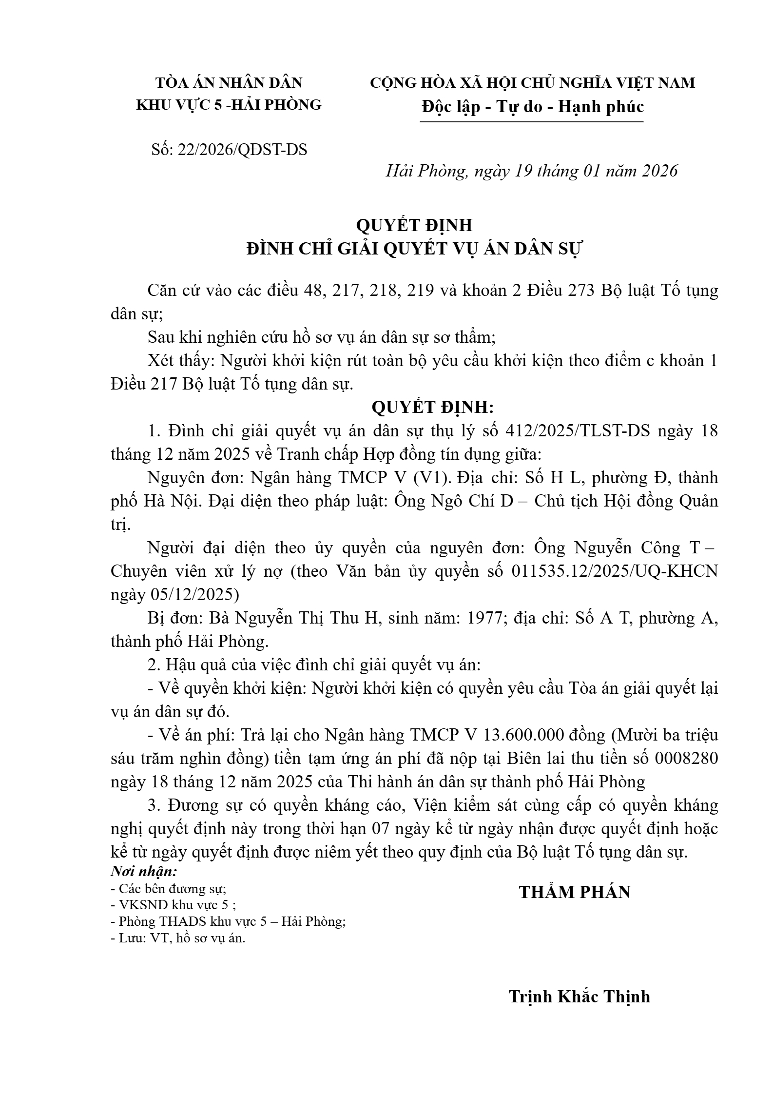 Quyết định số 22/2026/QĐST-DS ngày 19/01/2026 của Tòa án nhân dân khu vực 5 - Hải Phòng, TP. Hải Phòng về tranh chấp hợp đồng tín dụng