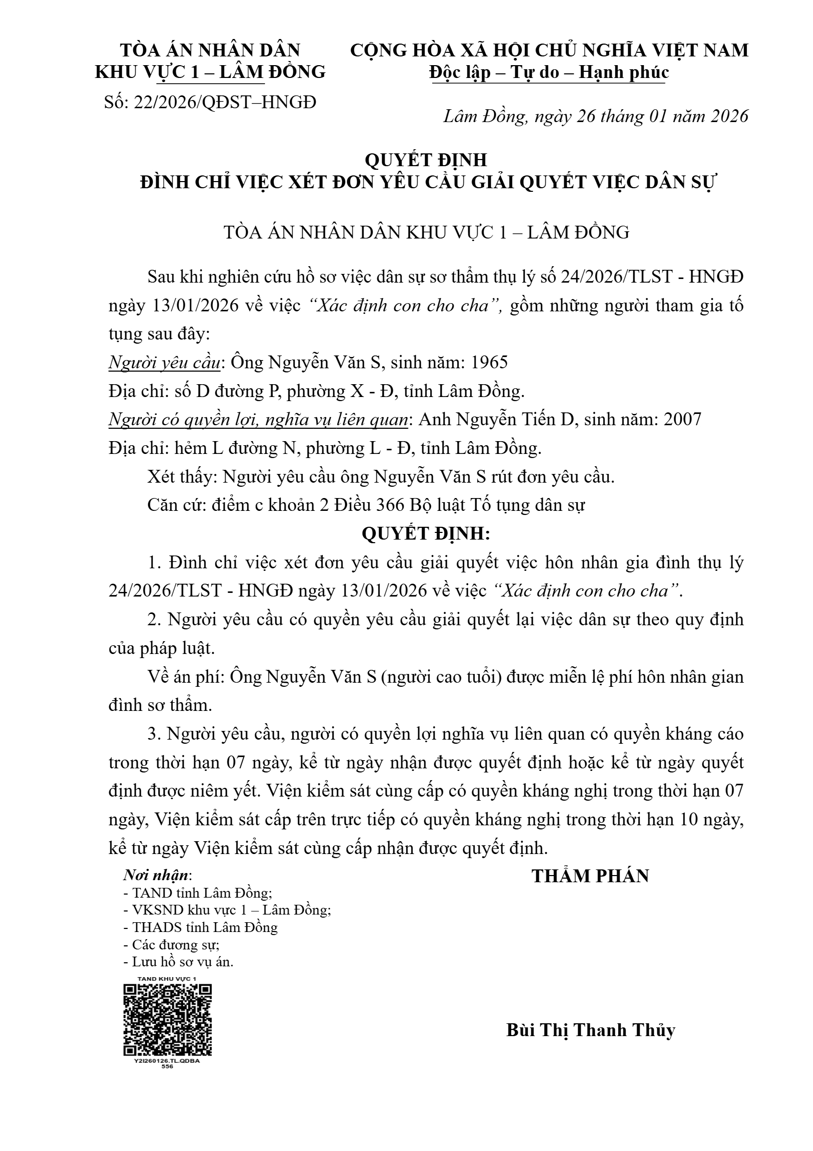 Quyết định số 22/2026/QĐST-HNGĐ ngày 26/01/2026 của Tòa án nhân dân khu vực 1 - Lâm Đồng, tỉnh Lâm Đồng về tranh chấp về xác định cha, mẹ cho con hoặc con cho cha mẹ