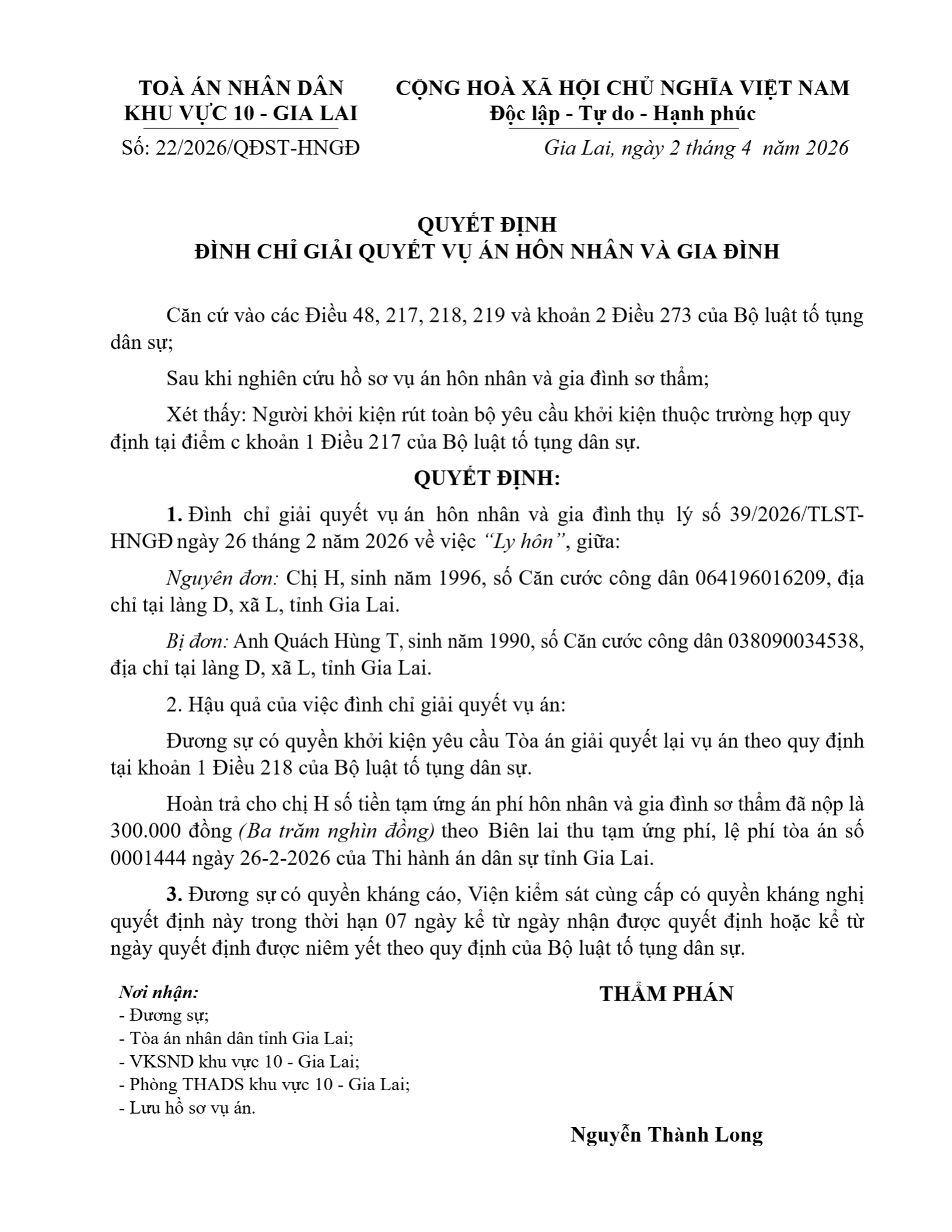 Quyết định số 22/2026/QĐST-HNGĐ ngày 02/04/2026 của Tòa án nhân dân khu vực 10 - Gia Lai, tỉnh Gia Lai về vụ án ly hôn về mâu thuẫn gia đình