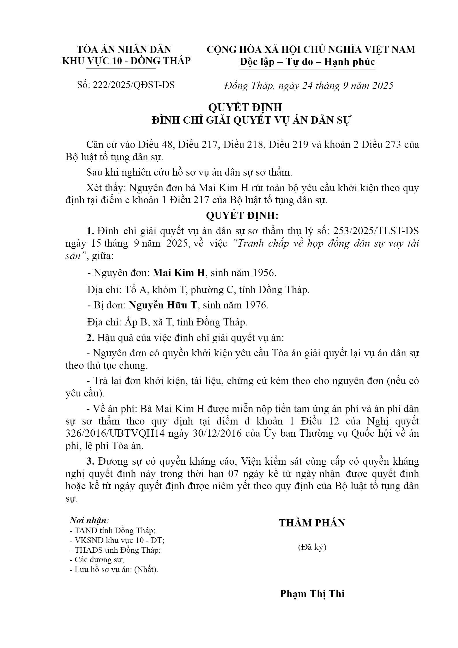 Quyết định số 222/2025/QĐST-DS ngày 24/09/2025 của Tòa án nhân dân khu vực 10 - Đồng Tháp, tỉnh Đồng Tháp về tranh chấp hợp đồng vay tài sản