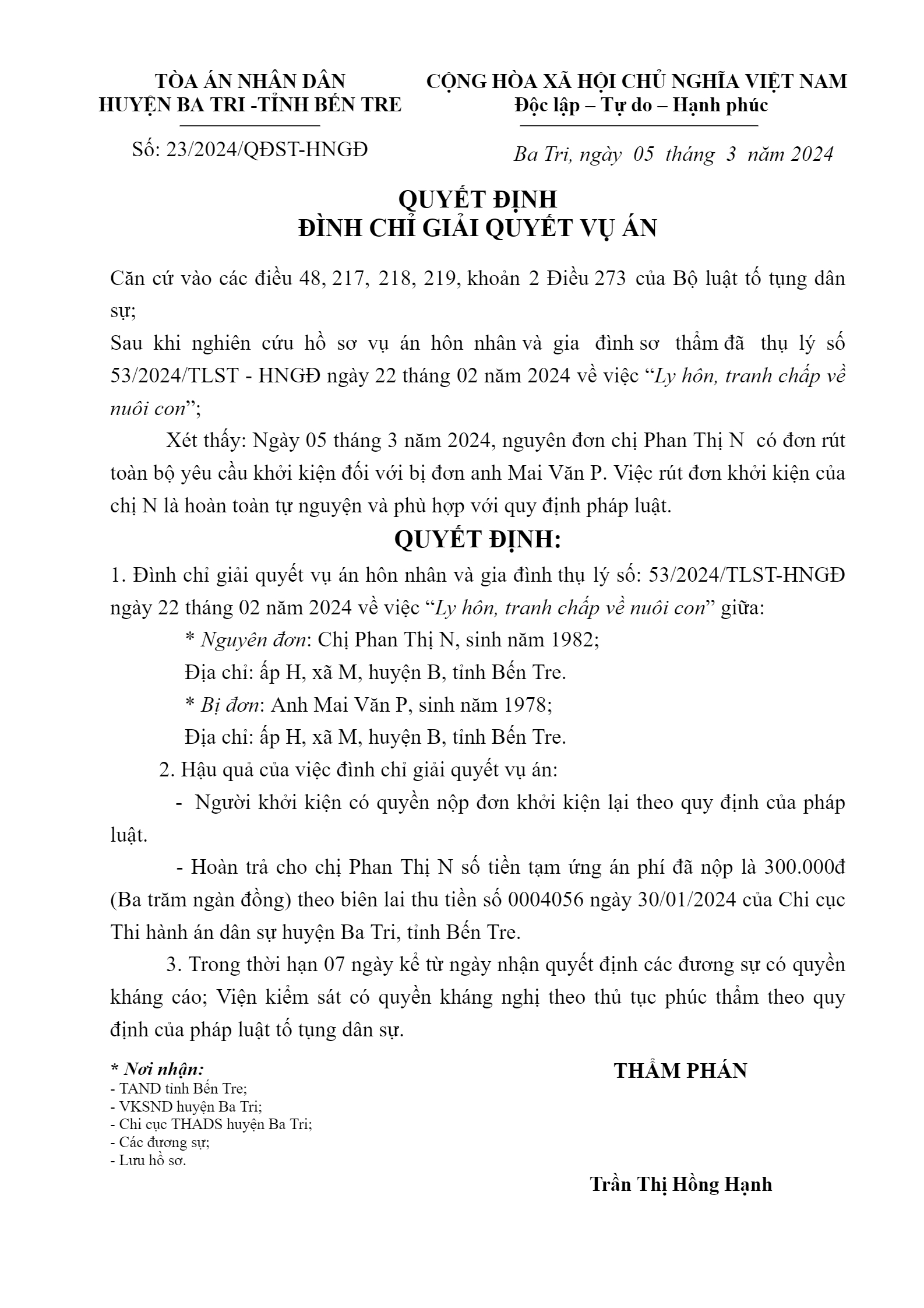 Quyết định số 23/2024/QĐST-HNGĐ ngày 05/03/2024 của TAND huyện Ba Tri, tỉnh Bến Tre về vụ án ly hôn về mâu thuẫn gia đình
