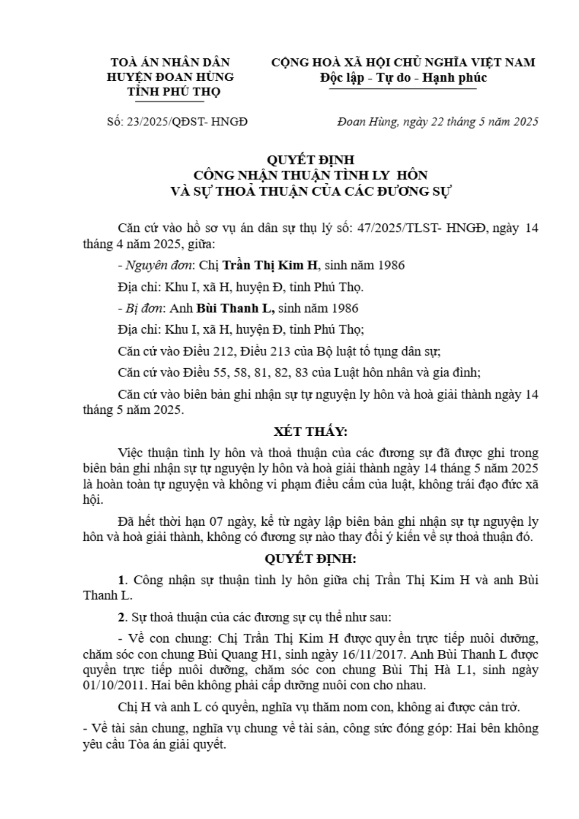 Quyết định số 23/2025/QĐST-HNGĐ ngày 22/05/2025 của TAND huyện Đoan Hùng, tỉnh Phú Thọ về vụ án ly hôn về mâu thuẫn gia đình