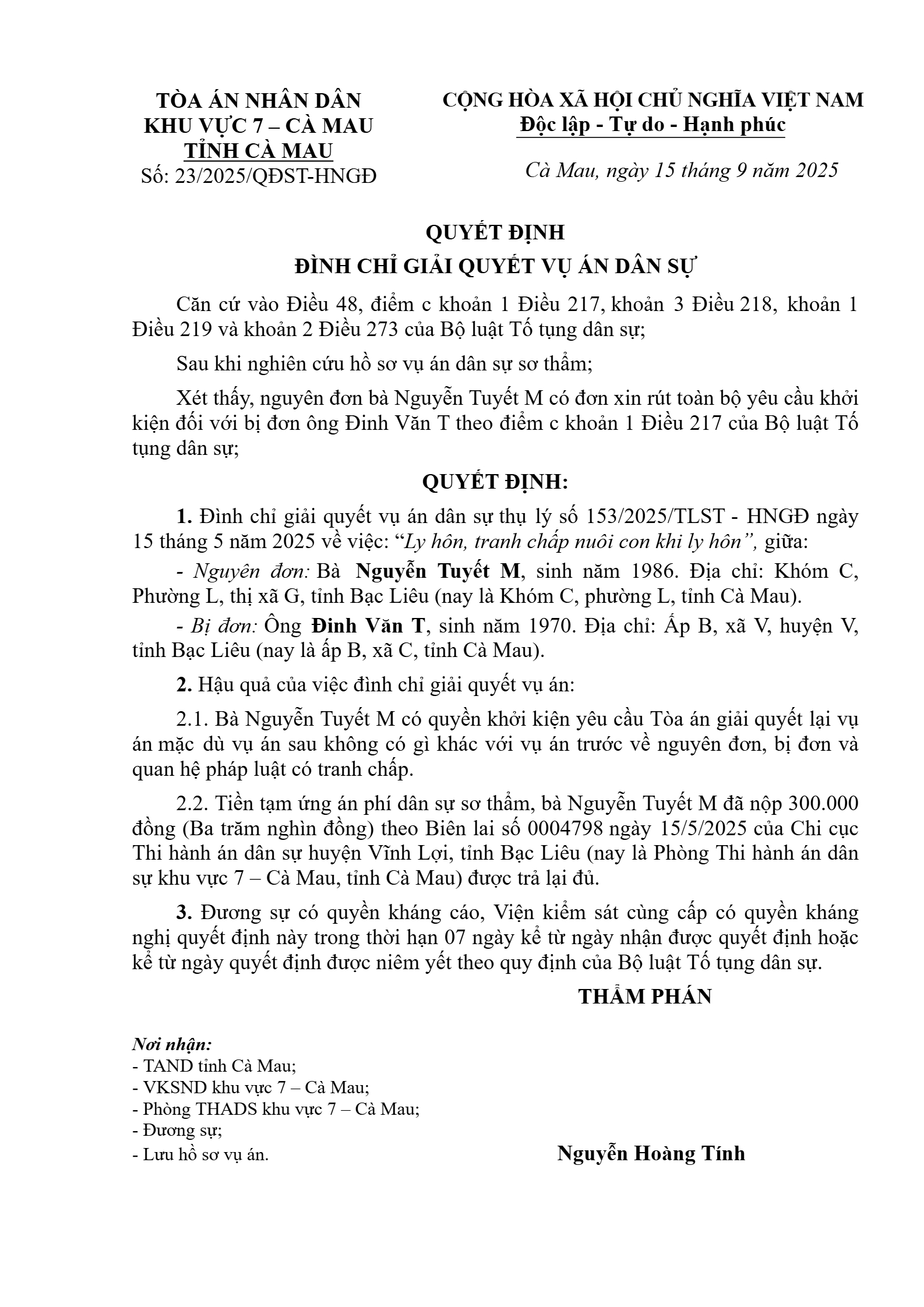 Quyết định số 23/2025/QĐST-HNGĐ ngày 15/09/2025 của Tòa án nhân dân khu vực 7 - Cà Mau, tỉnh Cà Mau về vụ án ly hôn về mâu thuẫn gia đình