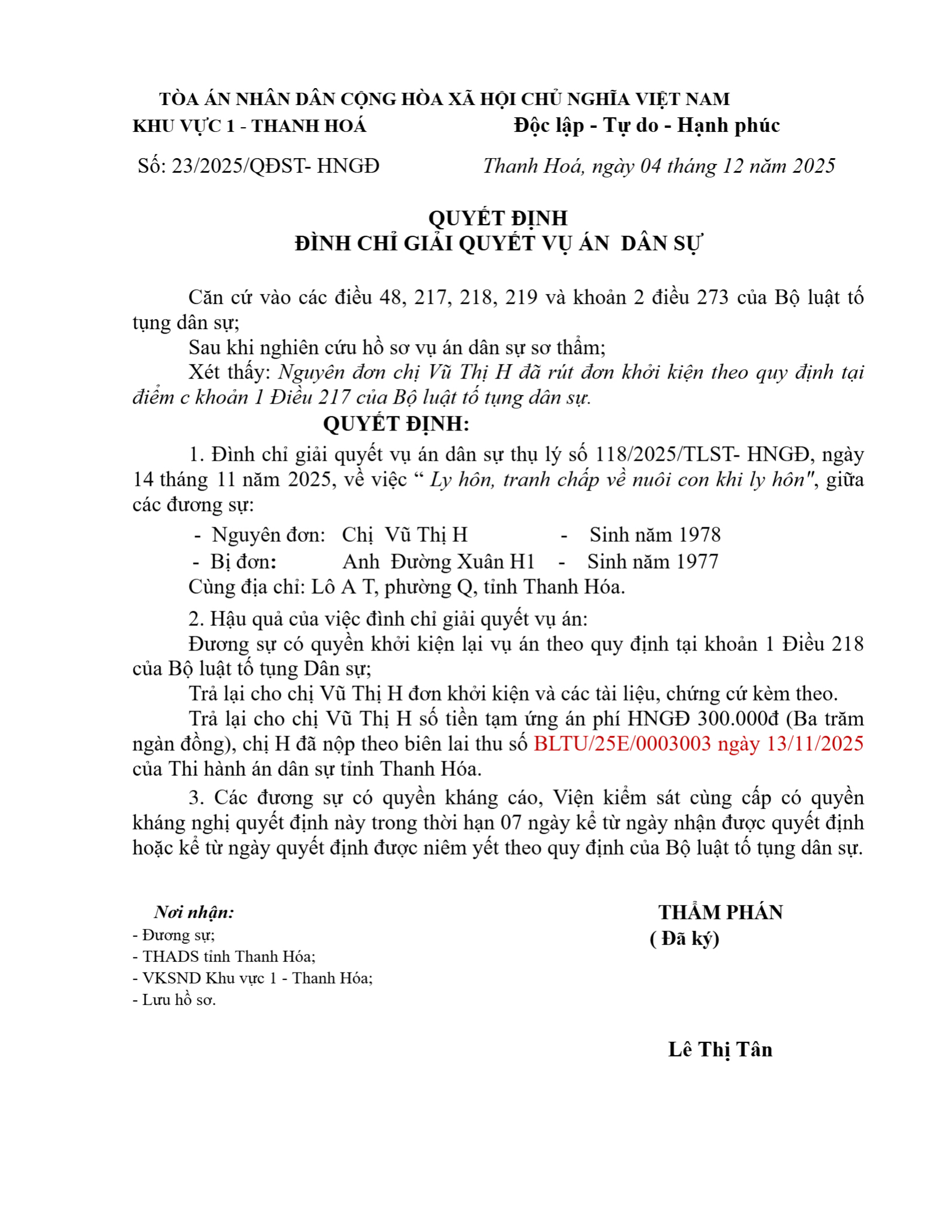 Quyết định số 23/2025/QĐST-HNGĐ ngày 04/12/2025 của Tòa án nhân dân khu vực 1 - Thanh Hóa, tỉnh Thanh Hóa về vụ án ly hôn về mâu thuẫn gia đình