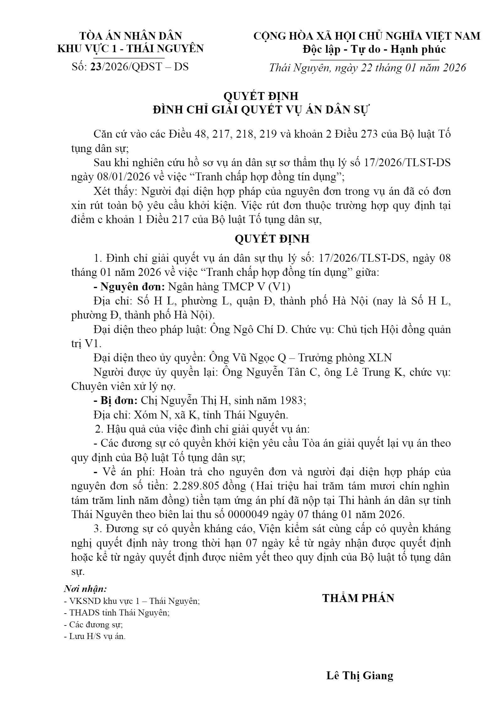 Quyết định số 23/2026/QĐST-DS ngày 22/01/2026 của Tòa án nhân dân khu vực 1 - Thái Nguyên, tỉnh Thái Nguyên về tranh chấp hợp đồng tín dụng