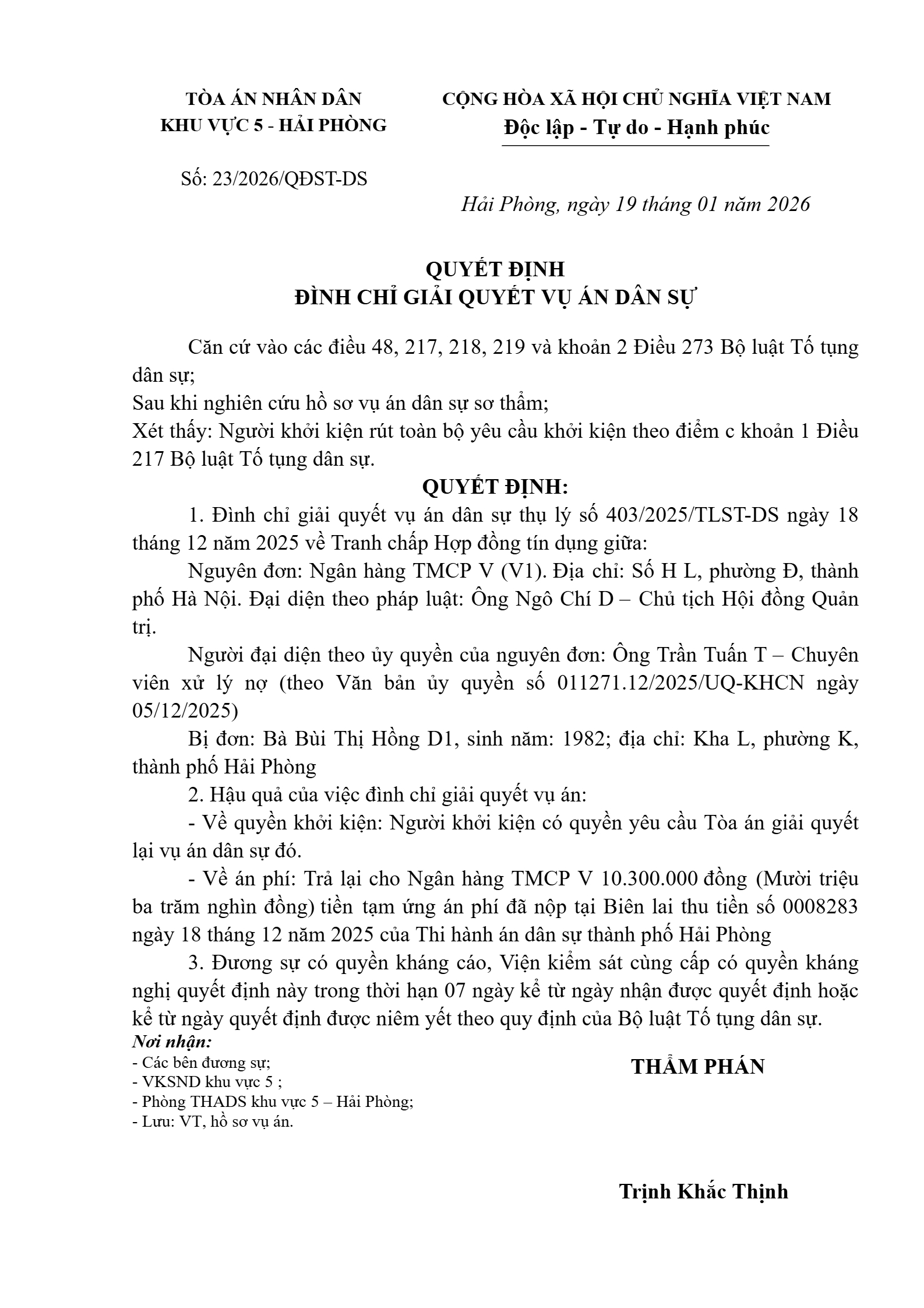 Quyết định số 23/2026/QĐST-DS ngày 19/01/2026 của Tòa án nhân dân khu vực 5 - Hải Phòng, TP. Hải Phòng về tranh chấp hợp đồng tín dụng