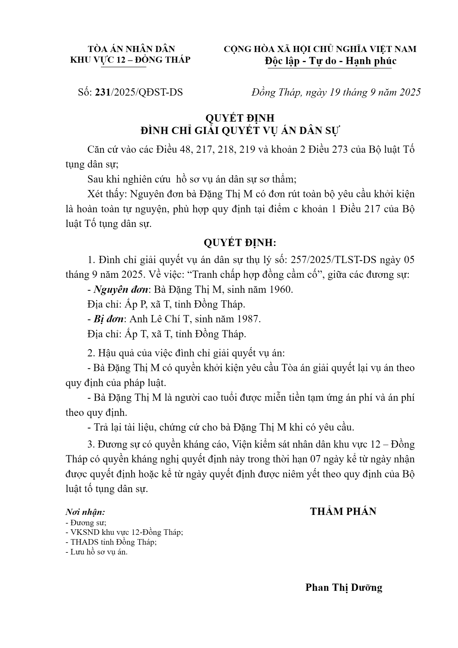 Quyết định số 231/2025/QĐST-DS ngày 19/09/2025 của Tòa án nhân dân khu vực 12 - Đồng Tháp, tỉnh Đồng Tháp về tranh chấp hợp đồng mượn tài sản