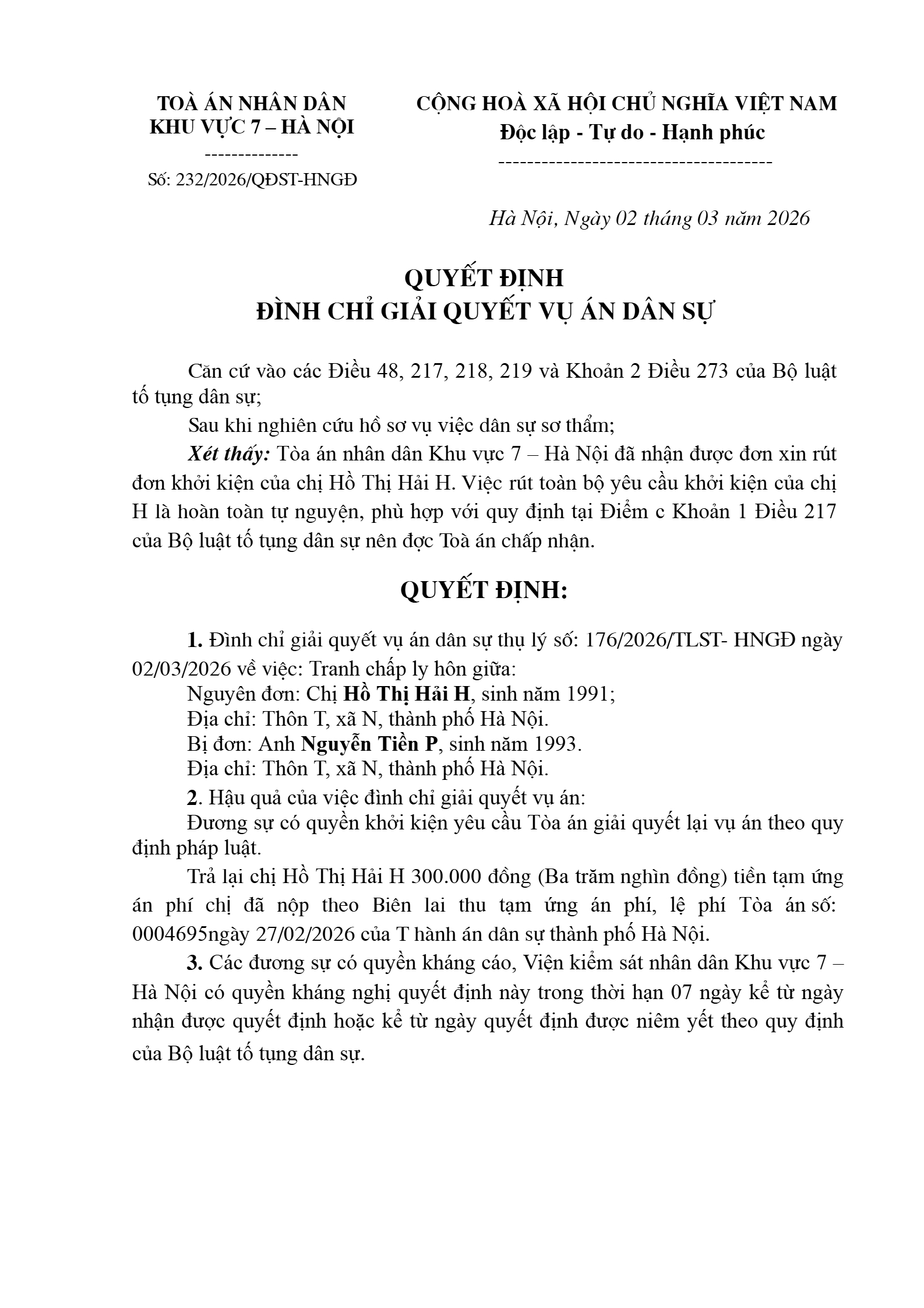 Quyết định số 232/2026/QĐST-HNGĐ
