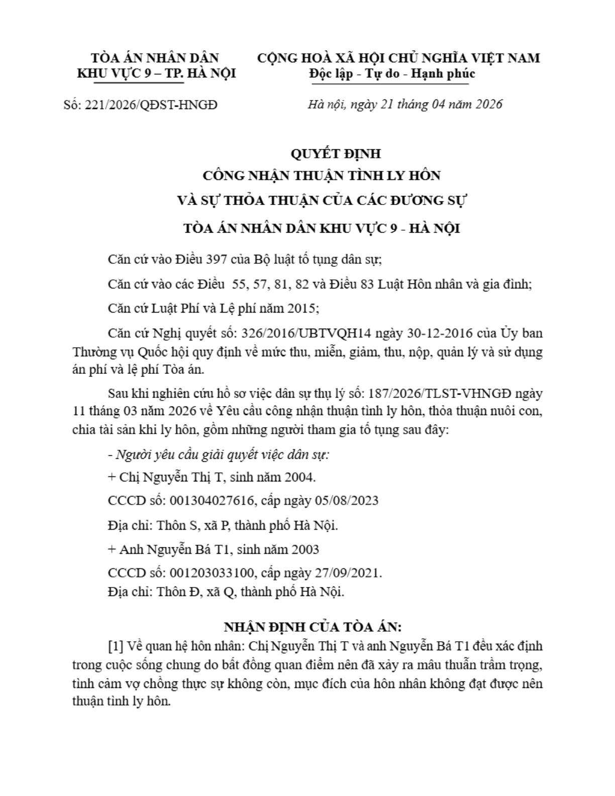 | Tên Quyết định: | Quyết định số 235/2026/QĐST-HNGĐ ngày 23/04/2026 của Tòa án nhân dân khu vực 9 - Hà Nội, TP. Hà Nội về vụ án ly hôn về mâu thuẫn gia đình |