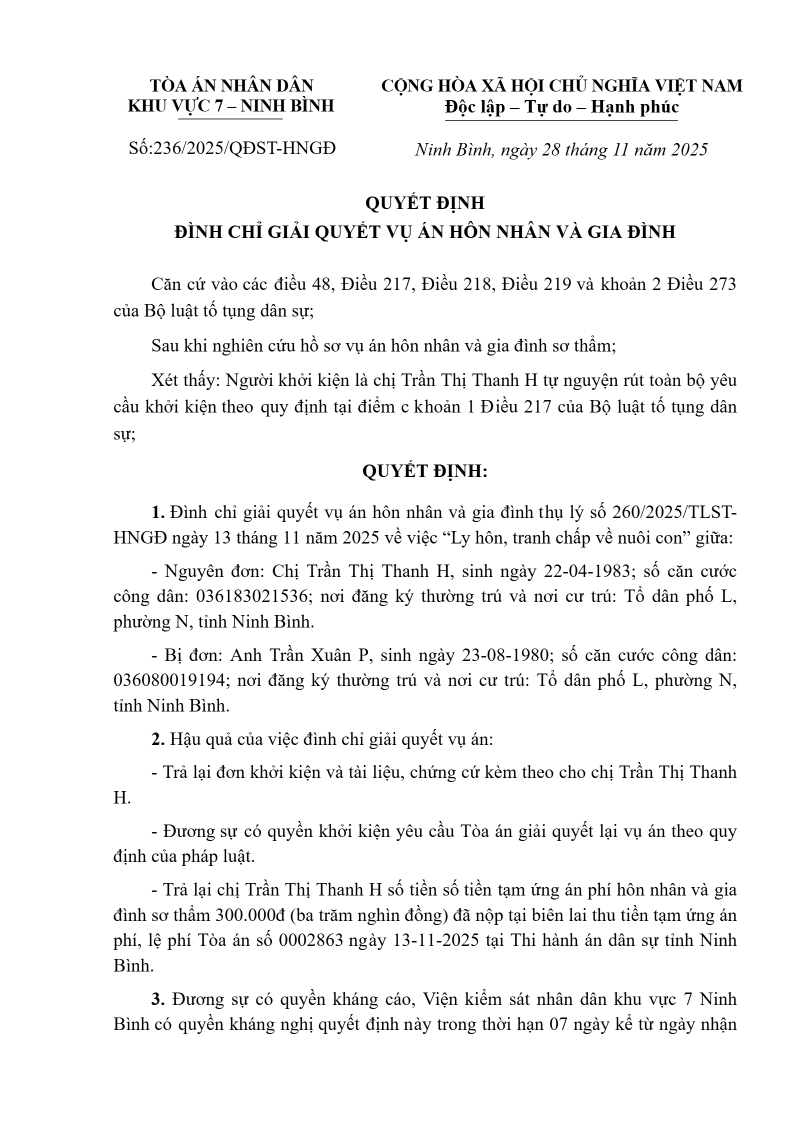 Quyết định số 236/2025/QĐST-HNGĐ ngày 28/11/2025 của Tòa án nhân dân khu vực 7 - Ninh Bình, tỉnh Ninh Bình về vụ án ly hôn về mâu thuẫn gia đình